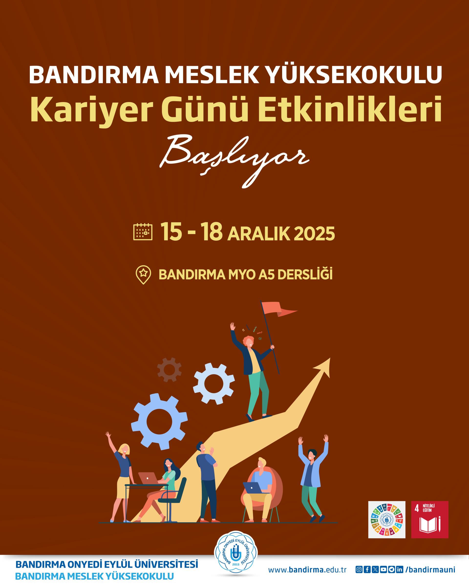 Bandırma Meslek Yüksekokulumuz tarafından, öğrencilerimizin mesleki gelişimlerini desteklemek, çeşitli sektörleri yakından tanımalarını sağlamak ve iş dünyası temsilcileriyle bir araya gelmelerine imkân sunmak amacıyla 15 -18 Aralık 2025 tarihleri arasında Kariyer Günü Etkinlikleri düzenlenecektir.