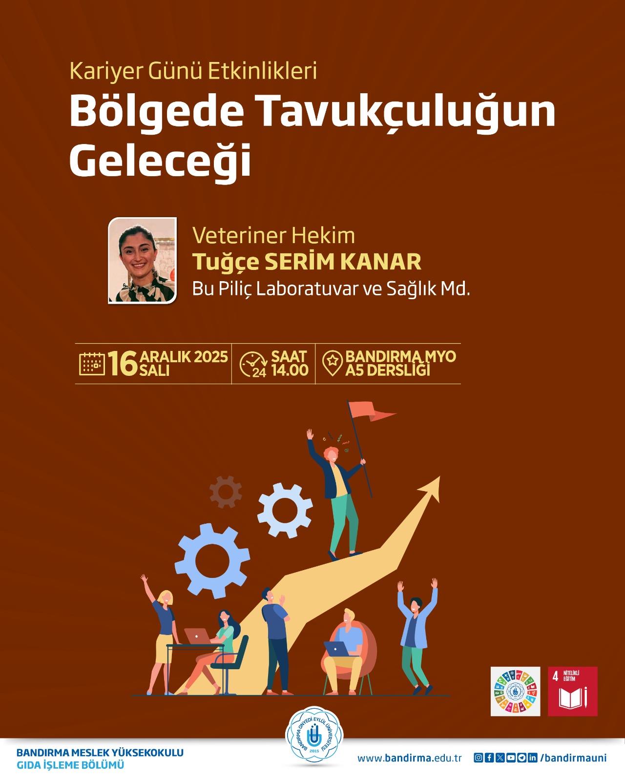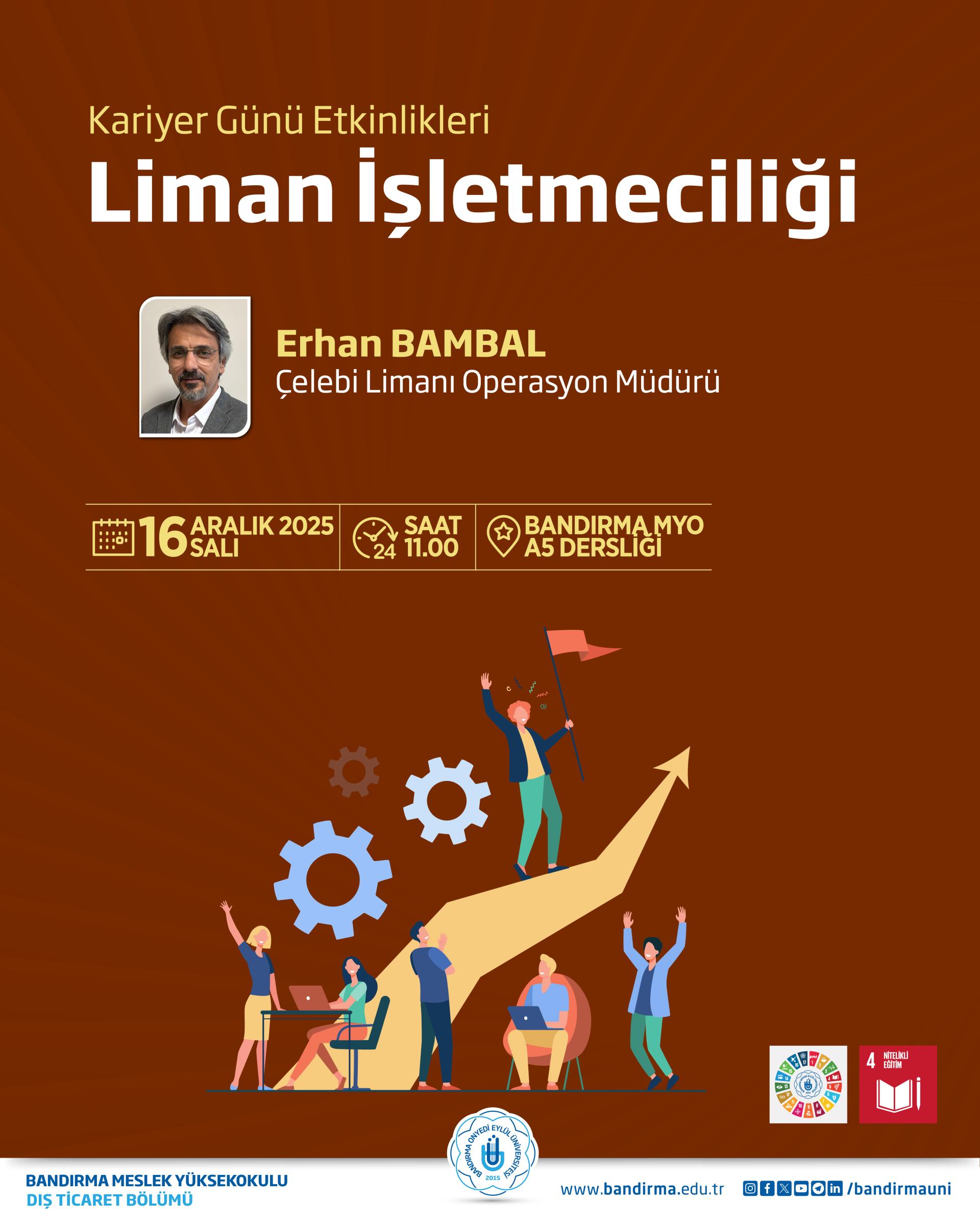 16 Aralık 2025 Salı günü saat 11.00’de, Çelebi Limanı Operasyon Müdürü Erhan Bambal, “Liman İşletmeciliği” konulu sunumuyla; aynı gün 16 Aralık 2025 Salı günü saat 13.00’te, Bu Piliç Laboratuvar ve Sağlık Müdürü Veteriner Hekim Tuğçe Serim Kanar, “Bölgede Tavukçuluğun Geleceği” başlıklı konuyla ilgili sektördeki gelişmeleri öğrencilerimize sunacaktır.