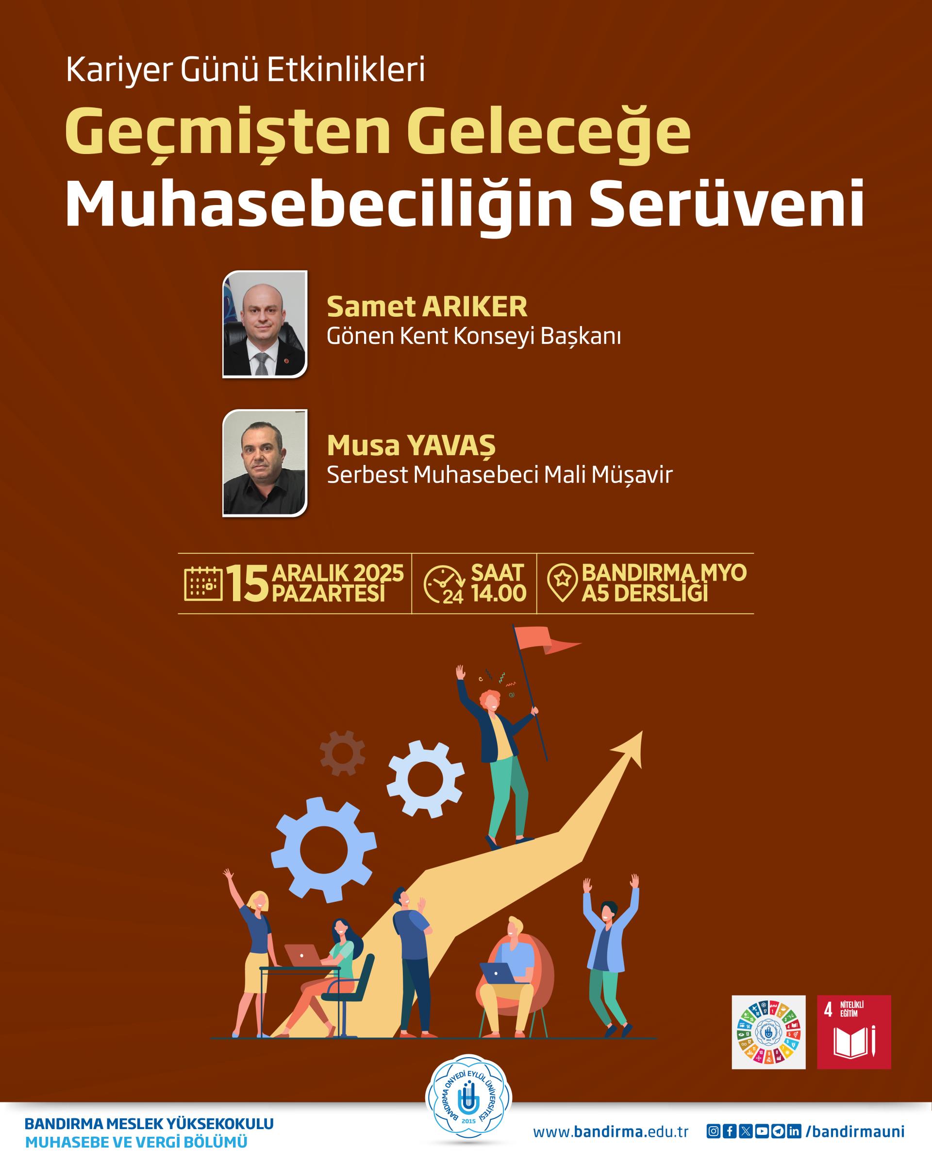 Program kapsamında 15 Aralık 2025 Pazartesi günü saat 14.00’te, Gönen Kent Konseyi Başkanı Samet Arıker ve Serbest Muhasebeci Mali Müşavir Musa Yavaş, “Geçmişten Geleceğe Muhasebeciliğin Serüveni” başlıklı sunumlarıyla bilgilerini öğrencilerimizle paylaşacaktır.