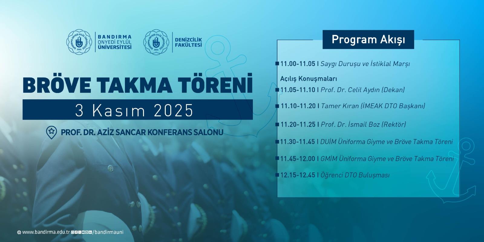 Rektörümüz Prof. Dr. İsmail Boz, İMEAK Deniz Ticaret Odası Yönetim Kurulu Başkanı Tamer Kıran ve Denizcilik Fakültesi Dekanımız Prof. Dr. Celil Aydın’ın konuşmalarıyla açılışı yapılacak program kapsamında; Türk Kaptanlar Derneği, GEMİMO, GİSBİR, Bandırma Ticaret Odası, Bandırma Ticaret Borsası, Erdek Ticaret Odası, Bandırma Bölge Liman Başkanlığı, Erdek Liman Başkanlığı ve Bandırma Gümrük Müdürlüğü temsilcilerinin katılımlarıyla bröve takdim töreni gerçekleştirilecektir. Törende, Deniz Ulaştırma İşletme Mühendisliği ve Gemi Makineleri İşletme Mühendisliği 1. sınıf öğrencilerine denizcilik mesleğine ilk adımı ve sorumluluğu simgeleyen bröveleri takdim edilecektir.