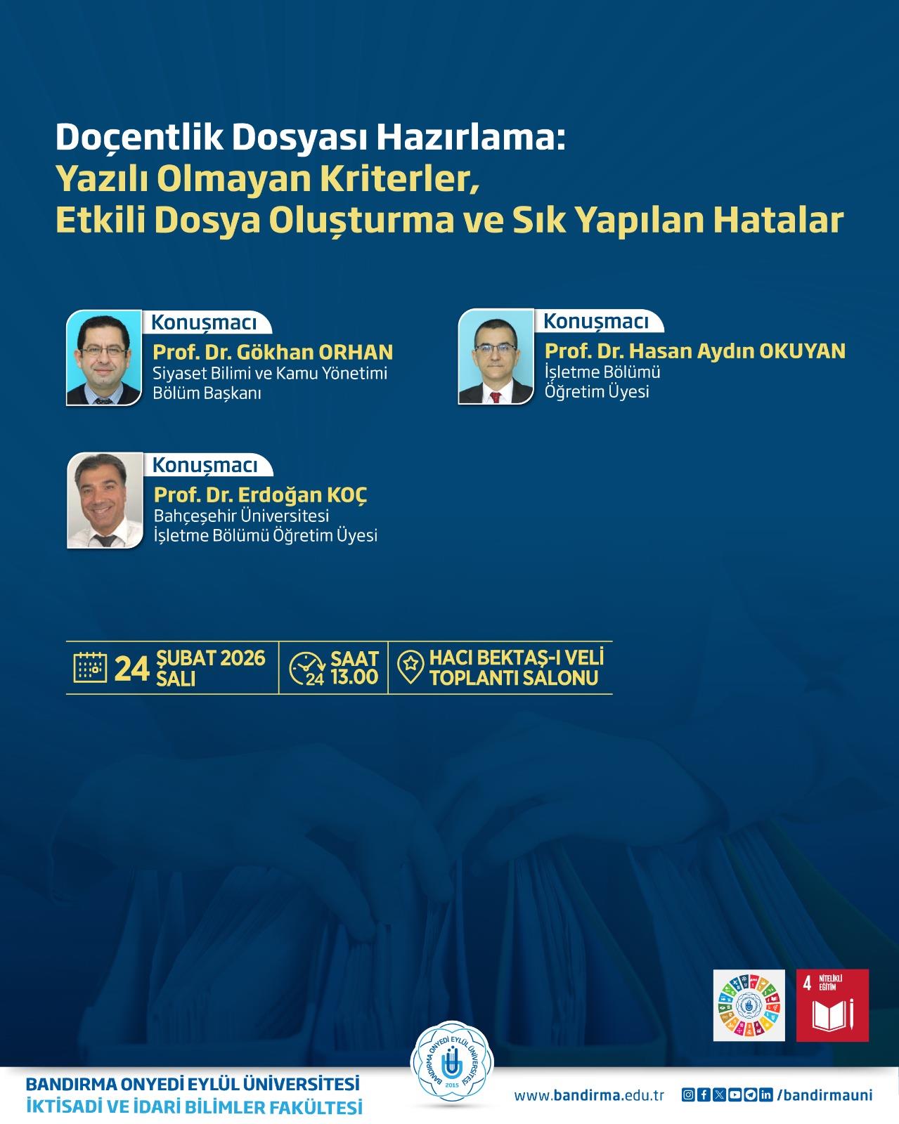 İktisadi ve İdari Bilimler Fakültemiz tarafından “Doçentlik Dosyası Hazırlama: Yazılı Olmayan Kriterler, Etkili Dosya Oluşturma ve Sık Yapılan Hatalar” başlıklı bir söyleşi düzenlenecektir.