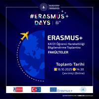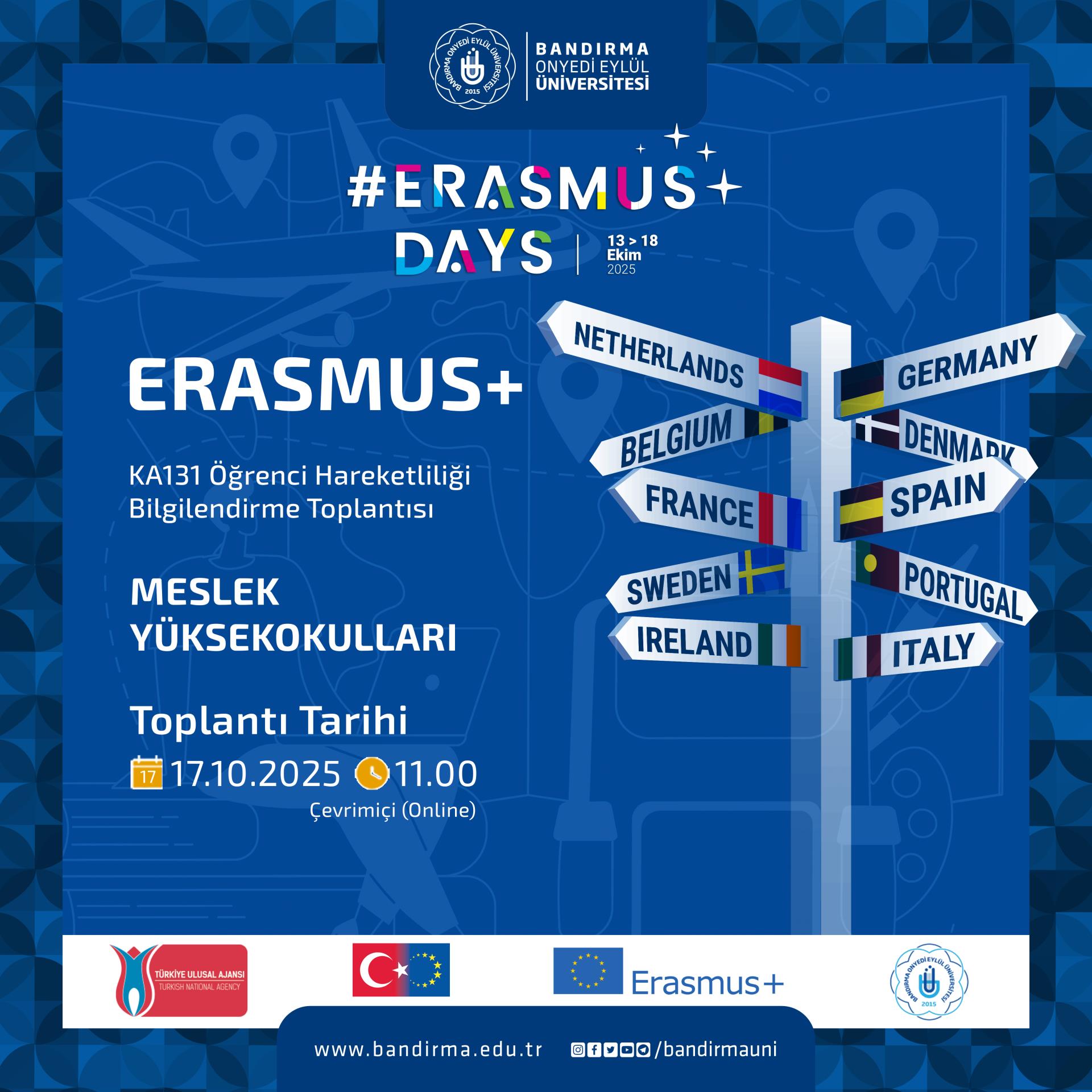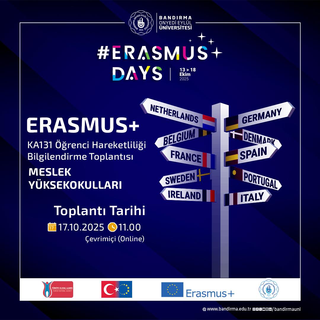 Erasmus Koordinatörlüğümüz tarafından, Erasmus+ Days (13–18 Ekim 2025) etkinlikleri kapsamında çevrim içi bilgilendirme toplantıları gerçekleştirilecektir. Bu toplantılarda, KA131 Öğrenci Hareketliliği programı hakkında detaylı bilgiler paylaşılacaktır.