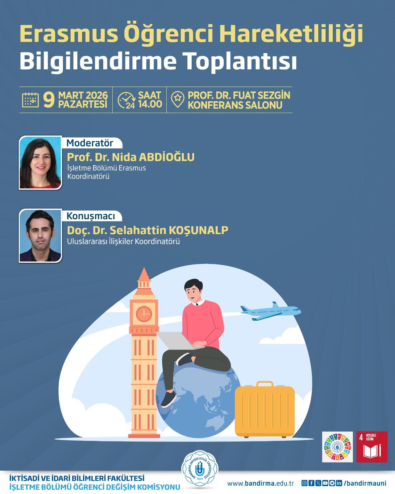 İktisadi ve İdari Bilimler Fakültesi İşletme Bölümü Öğrenci Değişim Komisyonu tarafından, “Erasmus Öğrenci Hareketliliği Bilgilendirme Toplantısı” düzenlenecektir.