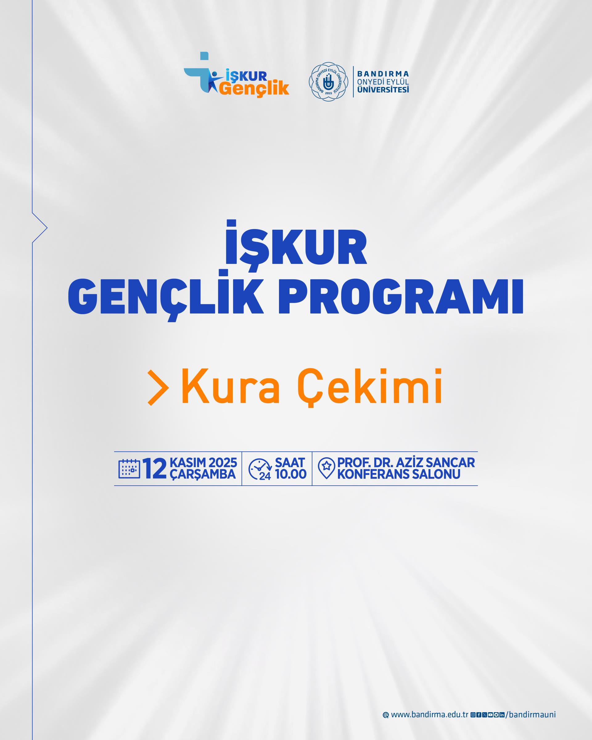 Cumhurbaşkanlığı tarafından başlatılan İŞKUR Gençlik Programı kapsamında, üniversite öğrencilerinin istihdam edilebilirliklerini artırmak, bilgi, beceri, çalışma alışkanlığı ve disiplini kazandırmak amacıyla üniversitemizde yürütülecek olan programın kura çekimi gerçekleştirilecektir.