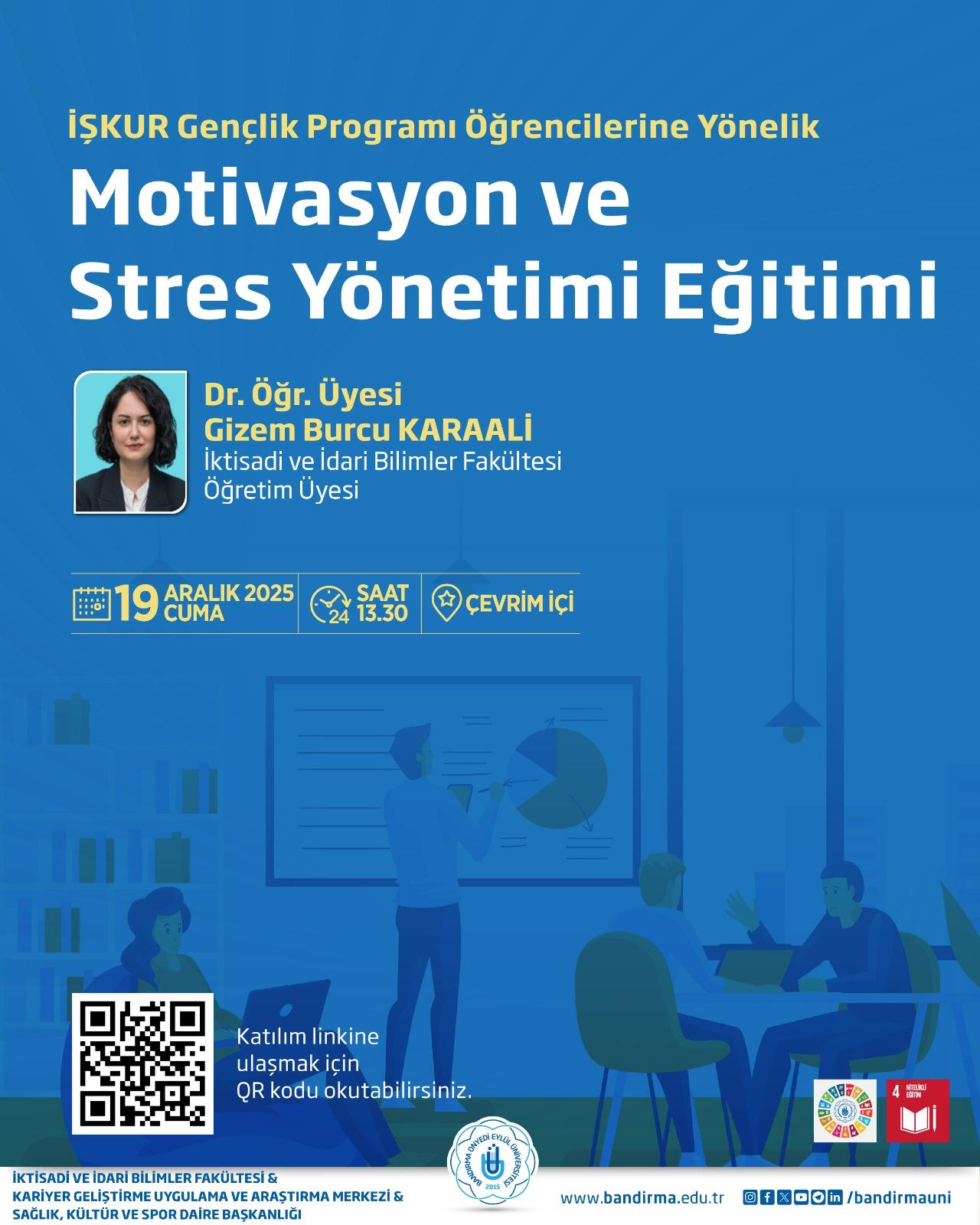 İktisadi ve İdari Bilimler Fakültemiz ile Kariyer Geliştirme Uygulama ve Araştırma Merkezimiz iş birliğinde, İŞKUR Gençlik Programı kapsamında öğrencilere yönelik “Motivasyon ve Stres Yönetimi Eğitimi” düzenlenecektir.