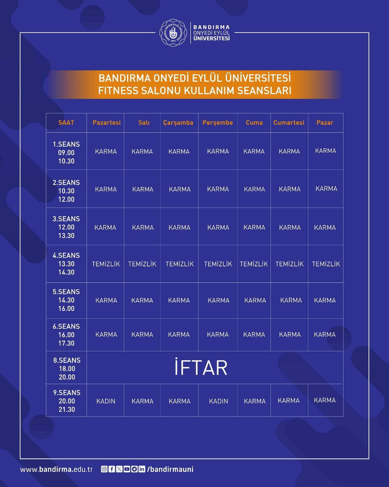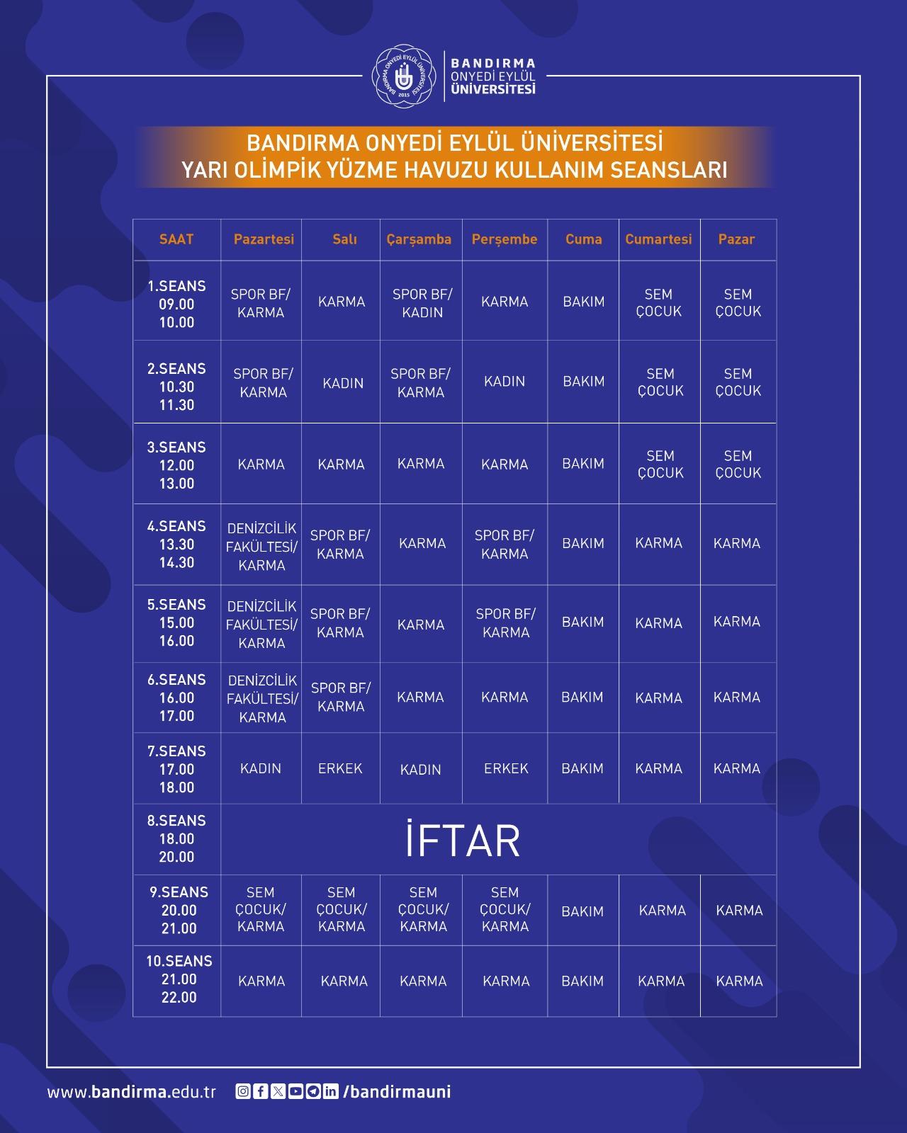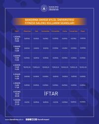 Ramazan ayı dolayısıyla Spor Bilimleri Fakültemiz bünyesinde ve BANÜ Spor Vadisi’nde yer alan Yarı Olimpik Yüzme Havuzu ile spor salonlarının kullanım saatleri güncellenmiştir.