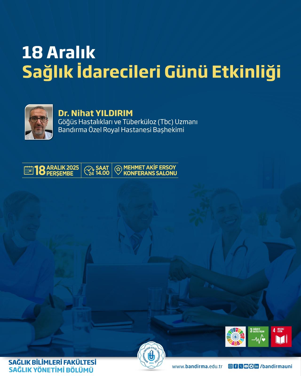 Etkinliğe, Bandırma Özel Royal Hastanesi Başhekimi, Göğüs Hastalıkları ve Tüberküloz Uzmanı Dr. Nihat Yıldırım konuşmacı olarak katılım sağlayacaktır. Etkinlik, 18 Aralık 2025 Perşembe günü saat 14.00’te Mehmet Akif Ersoy Konferans Salonu’nda gerçekleştirilecektir.