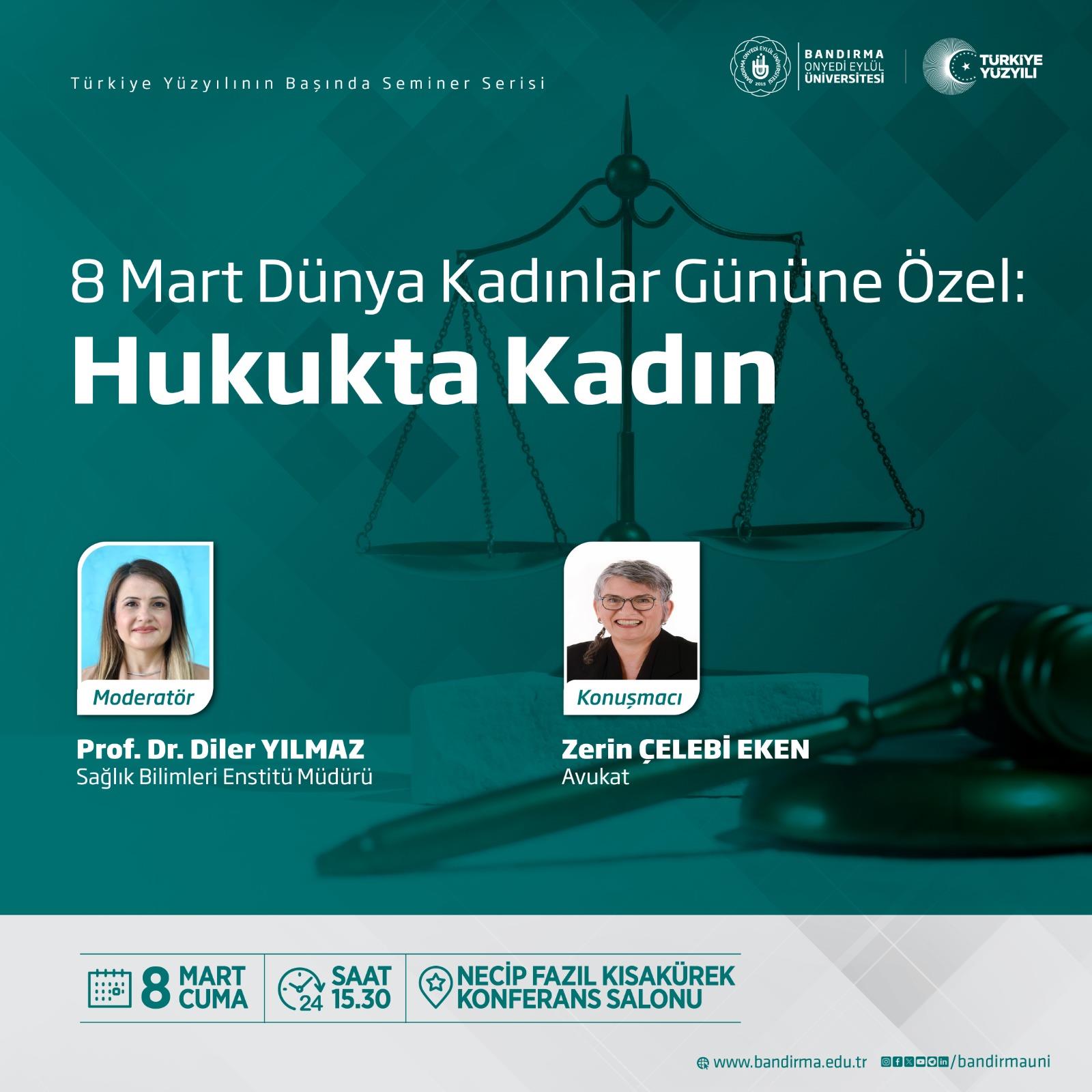 “Türkiye Yüzyılının Başında” seminer serimiz kapsamında, 8 Mart 2024 Cuma günü saat 15.30’da Necip Fazıl Kısakürek Konferans Salonu’nda “8 Mart Dünya Kadınlar Gününe Özel: Hukukta Kadın” konulu seminer düzenlenecektir. Moderatörlüğünü Sağlık Bilimleri Enstitü Müdürümüz Prof. Dr. Diler Yılmaz’ın üstleneceği seminere, konuşmacı olarak Avukat Zerin Çelebi Eken katılım sağlayacaktır.