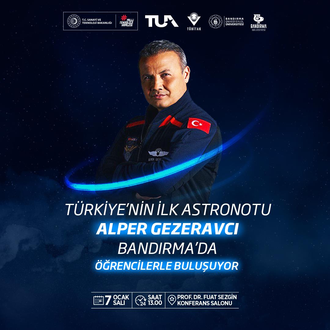 Türkiye’nin uzay çalışmalarındaki ilk astronotu Alper Gezeravcı, Üniversitemizde öğrencilerimizle buluşuyor. Uzay araştırmalarında Türkiye’yi başarıyla temsil eden Alper Gezeravcı, öğrencilerimize ilham vermek ve tecrübelerini paylaşmak üzere konferans gerçekleştirecektir.