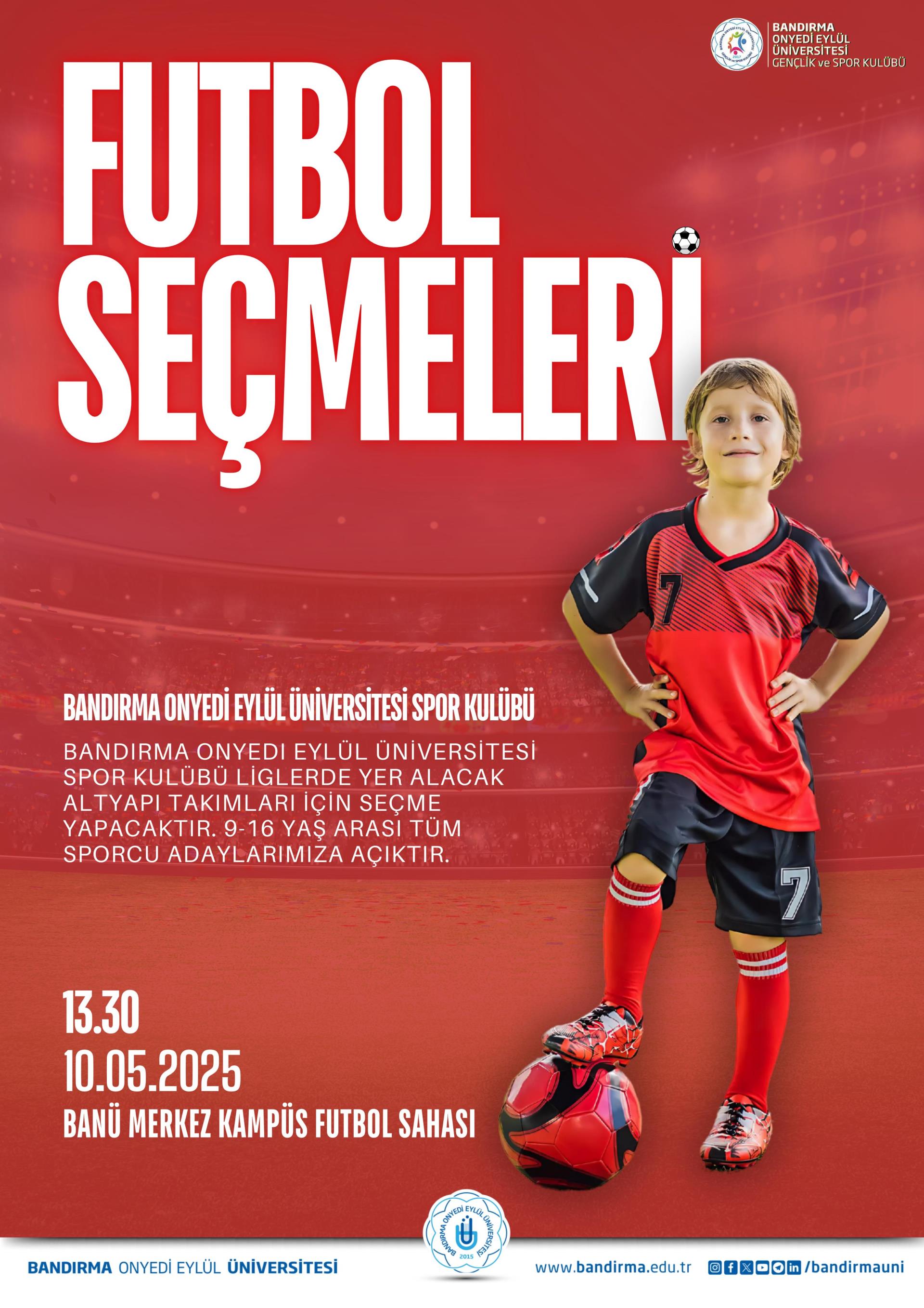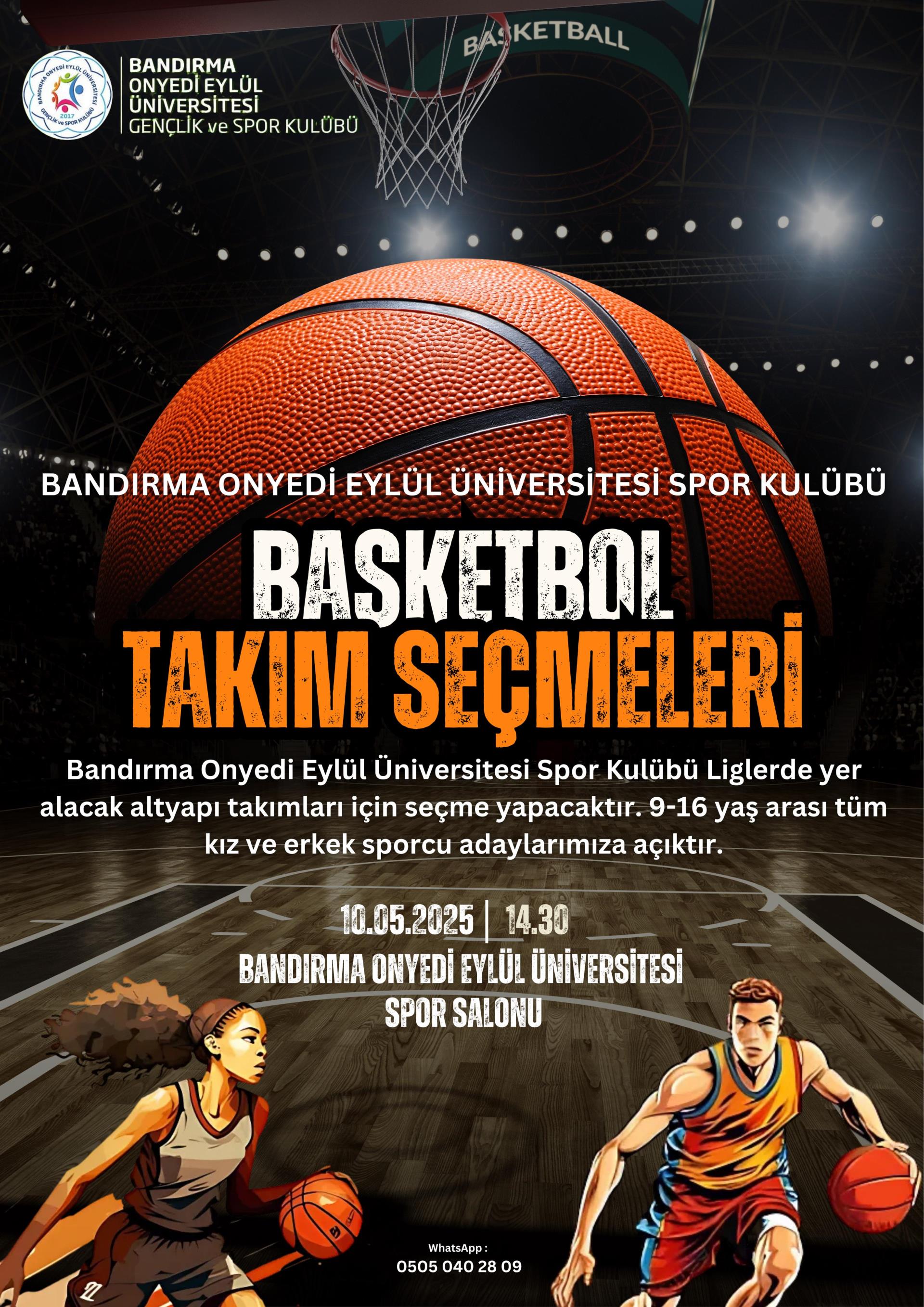 Üniversitemiz Spor Bilimleri Fakültesine bağlı olarak faaliyet gösteren Bandırma Onyedi Eylül Üniversitesi Gençlik ve Spor Kulübü tarafından, yerel liglerde mücadele edecek yaş grubu basketbol ve futbol takımlarının oluşturulması amacıyla seçmeler düzenlenecektir.
