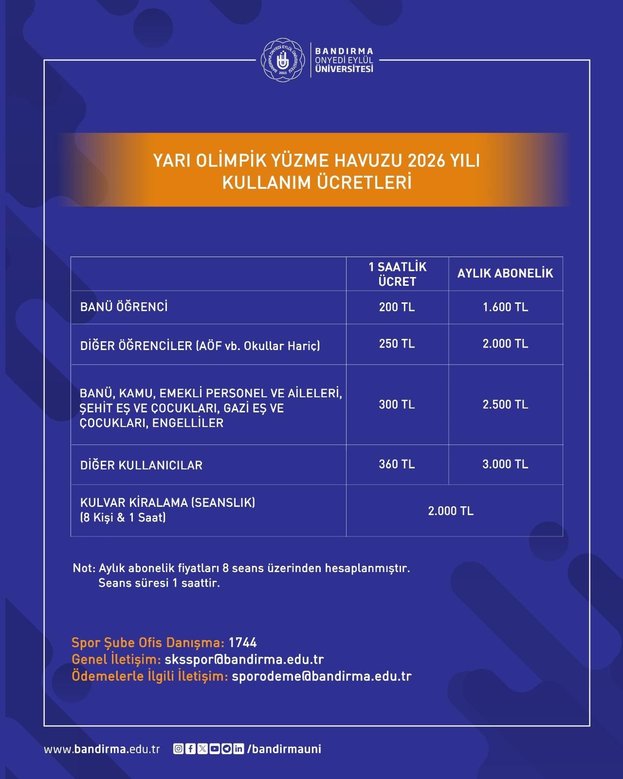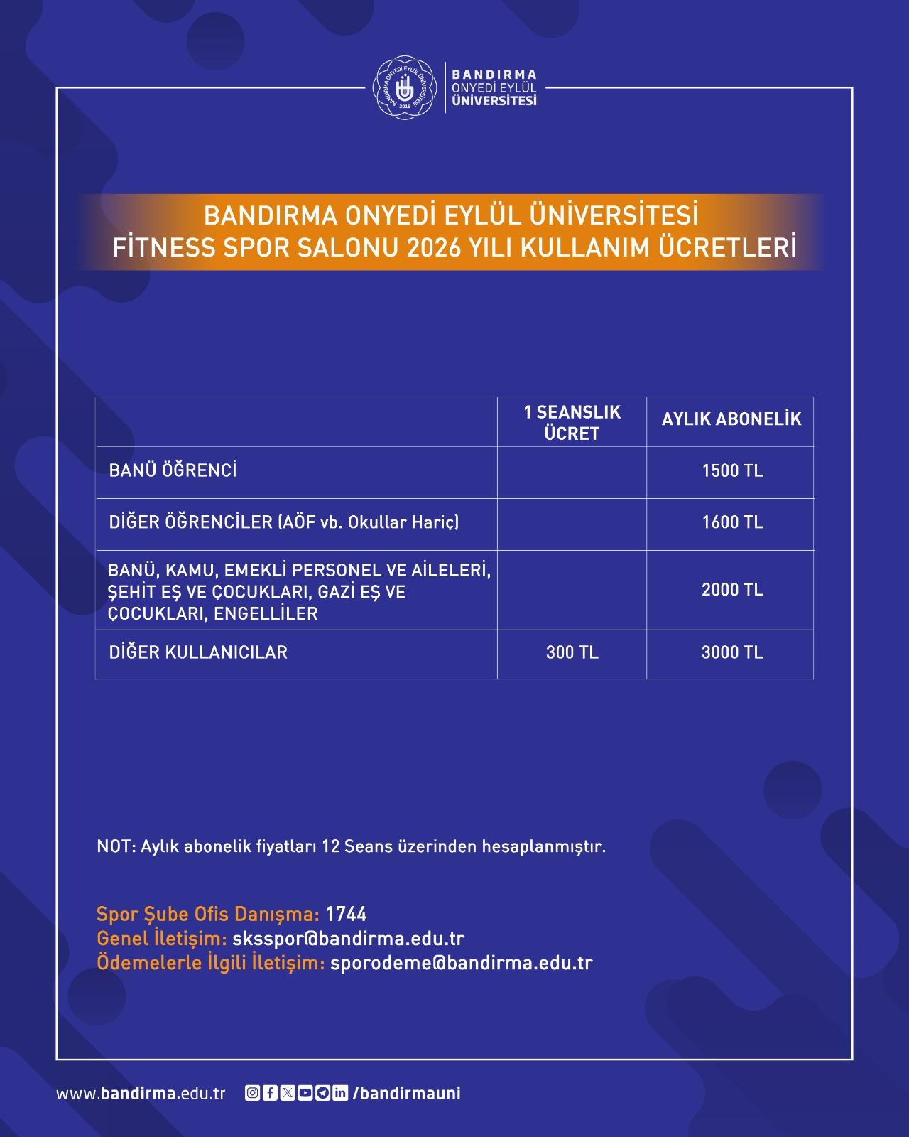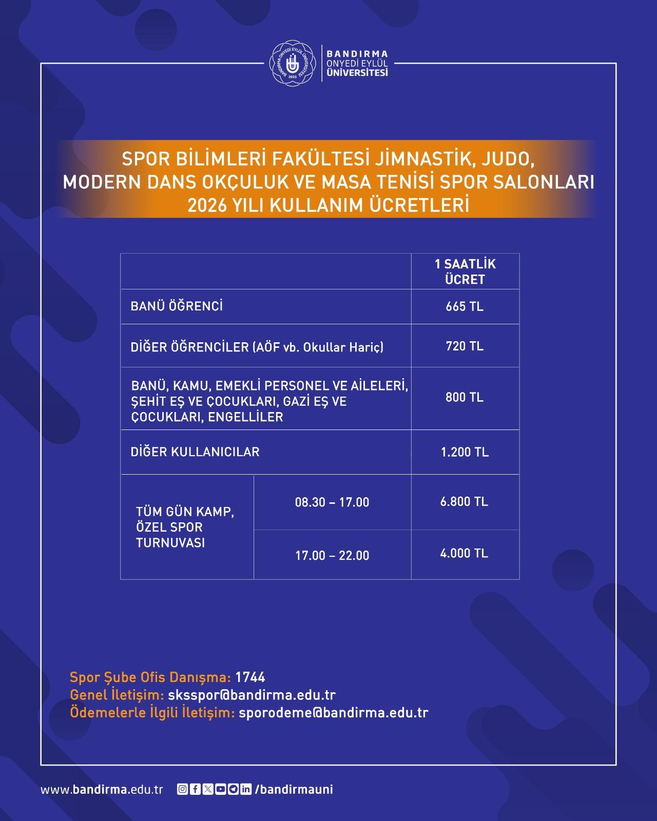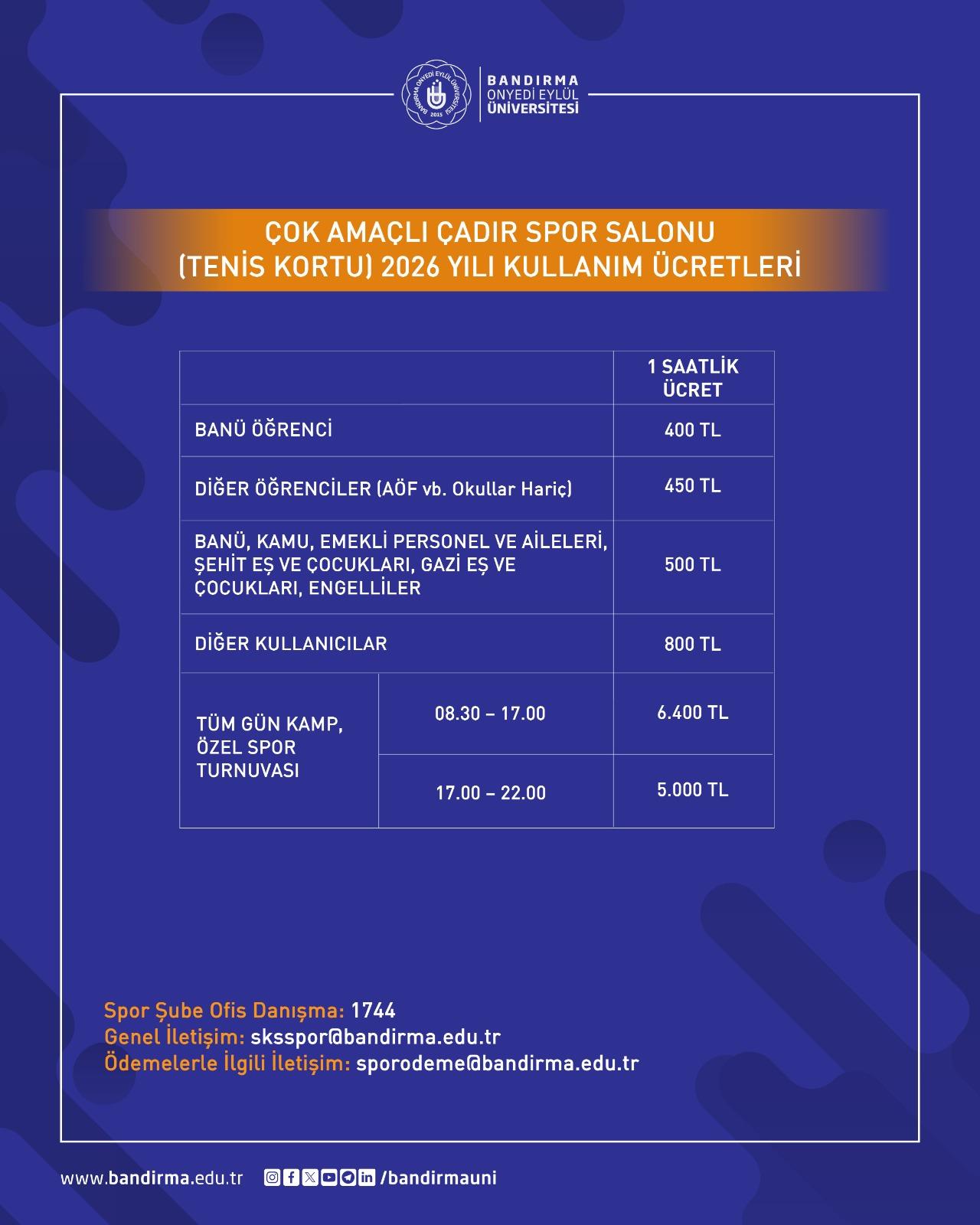 Üniversitemiz Sağlık, Kültür ve Spor Daire Başkanlığı'na bağlı faaliyet gösteren BANÜ Spor Vadisi Tesisleri'nin kullanım ücretleri güncellendi.