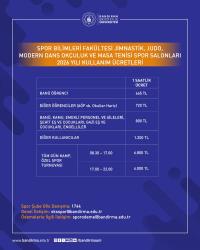 Yüzmeden tenise, jimnastikten okçuluğa bir çok spor faaliyetinin gerçekleştirilebildiği tesislerimizde uygulanacak olan yeni tarifenin hayırlı olmasını diliyor, spor ve sporcu dostu üniversite olarak tüm öğrencilerimizi, personelimizi ve halkımızı tesislerimizin imkanlarından yararlanmaya davet ediyoruz.