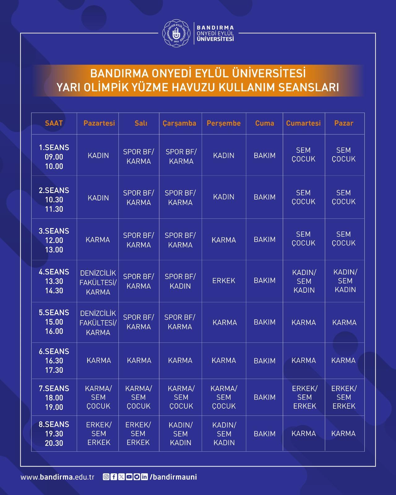Akademik ve idari personelimiz ile öğrencilerimizin yanı sıra vatandaşlarımızın da yararlanabildiği yüzme havuzunda, hafta içi ve hafta sonu günleri için planlanan seanslar; kadın, erkek, karma ve çocuk gruplarına yönelik olarak düzenlendi.