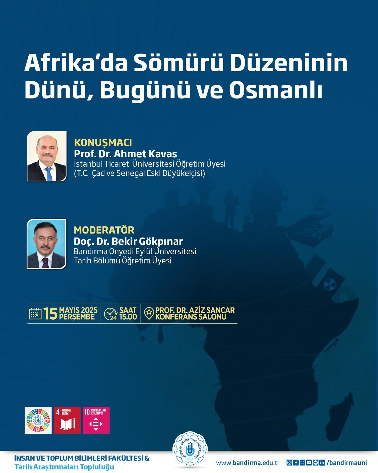 Üniversitemiz İnsan ve Toplum Bilimleri Fakültesi ile Tarih Araştırmaları Topluluğu tarafından “Afrika’da Sömürü Düzeninin Dünü, Bugünü ve Osmanlı” başlıklı bir konferans düzenlenecektir.
