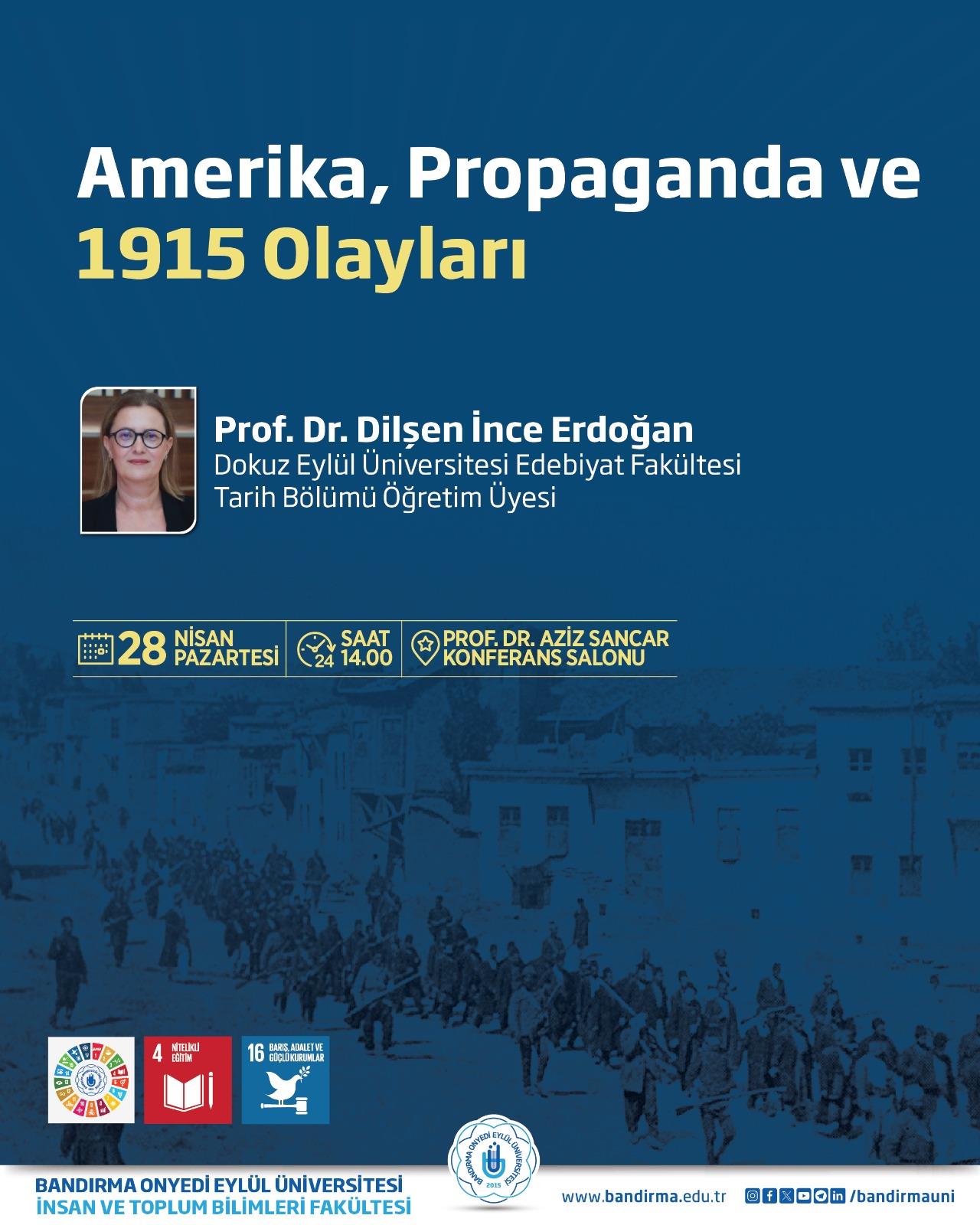 İnsan ve Toplum Bilimleri Fakültemiz tarafından “Amerika, Propaganda ve 1915 Olayları” konulu konferans düzenlenecektir. Konferansa Dokuz Eylül Üniversitesi, Edebiyat Fakültesi Tarih Bölümü Öğretim Üyesi Prof. Dr. Dilşen İnce Erdoğan konuşmacı olarak katılacaktır.