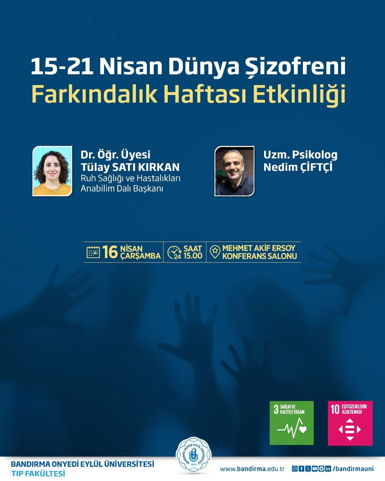 Üniversitemiz Tıp Fakültesi tarafından 15-21 Nisan Dünya Şizofreni Farkındalık Haftası Etkinliği düzenlenecektir.