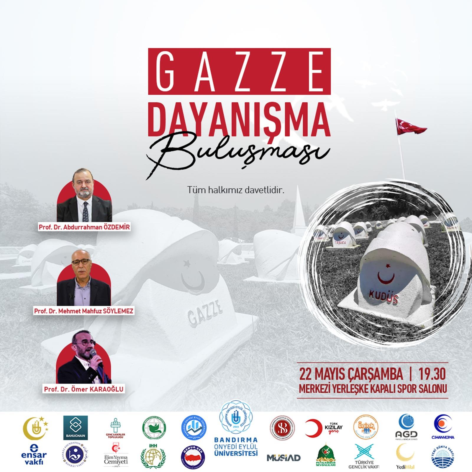 7 Ekim 2023 tarihinde başlayan, İsrail’in kadın ve çocuk ayırt etmeksizin Filistin ve Gazze’deki masum sivillere yönelik vahşi tutumuna, saldırılarına ve bölgede yaşanan insanlık dramına dikkat çekmek adına Üniversitemiz ve sivil toplum kuruluşları iş birliği ile 22 Mayıs 2024 Çarşamba günü saat 19:30’da BANÜ-Spor Vadisi Kapalı Spor Salonu’nda Gazze Dayanışma Buluşması gerçekleştirilecektir.