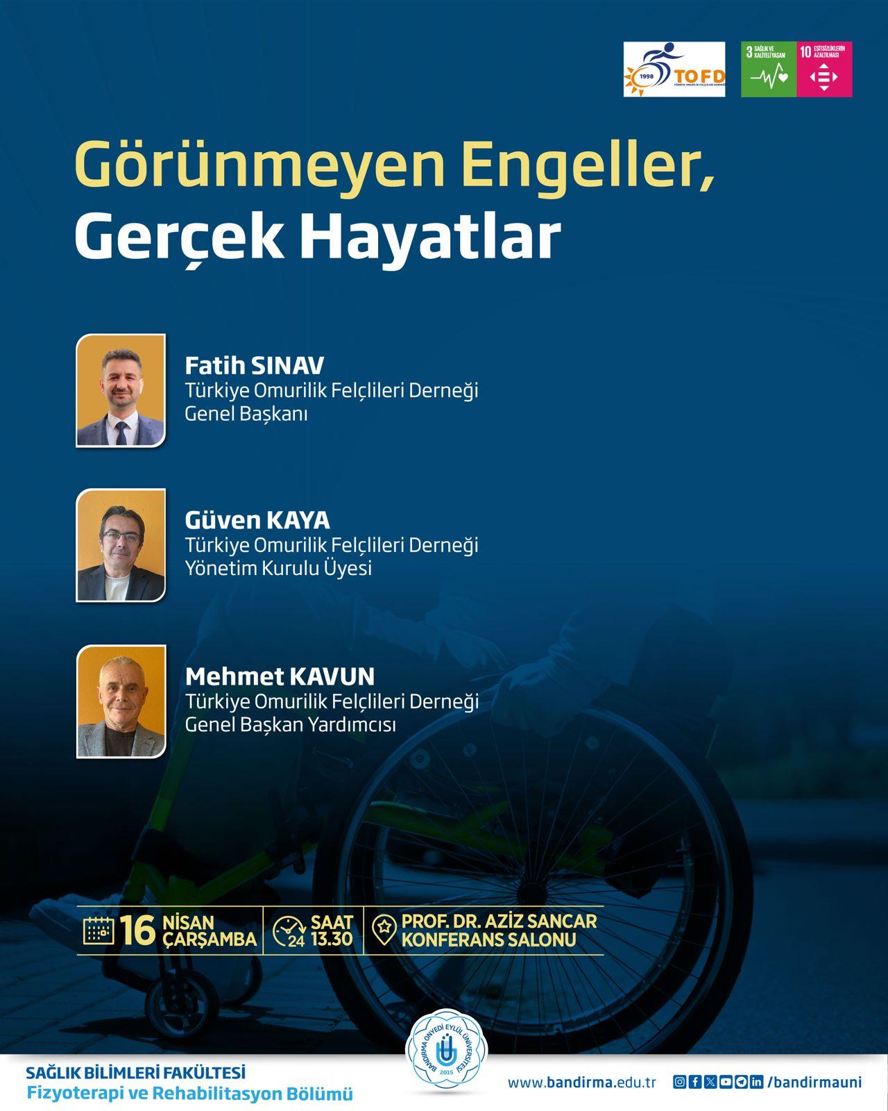 Üniversitemiz Sağlık Bilimleri Fakültesi Fizyoterapi ve Rehabilitasyon Bölümü ve TOFD (Türkiye Omurilik Felçliler Derneği) iş birliği ile “Görünmeyen Engeller Gerçek Hayatlar” konulu konferans düzenlenecektir.