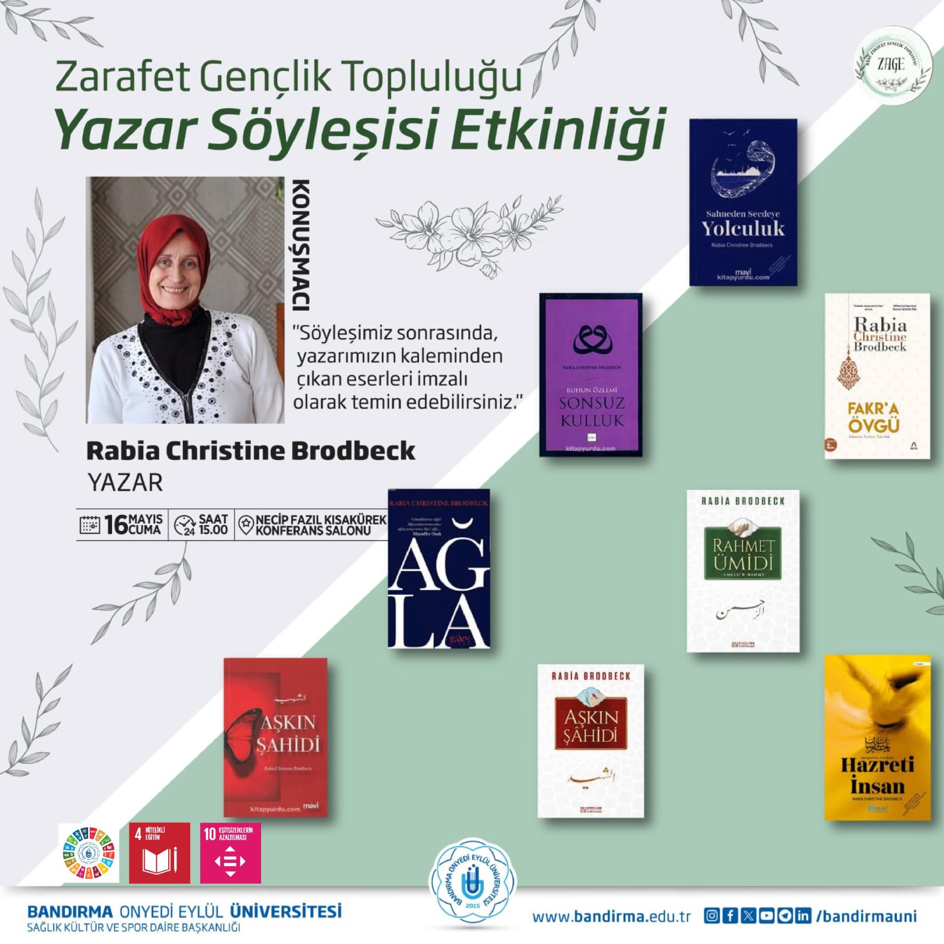 Zarafet Gençlik Topluluğu tarafından düzenlenen kültürel etkinlikler kapsamında Yazar Rabia Christine Brodbeck, konuk konuşmacı olarak öğrencilerimizle ve katılımcılarla bir araya gelecektir.