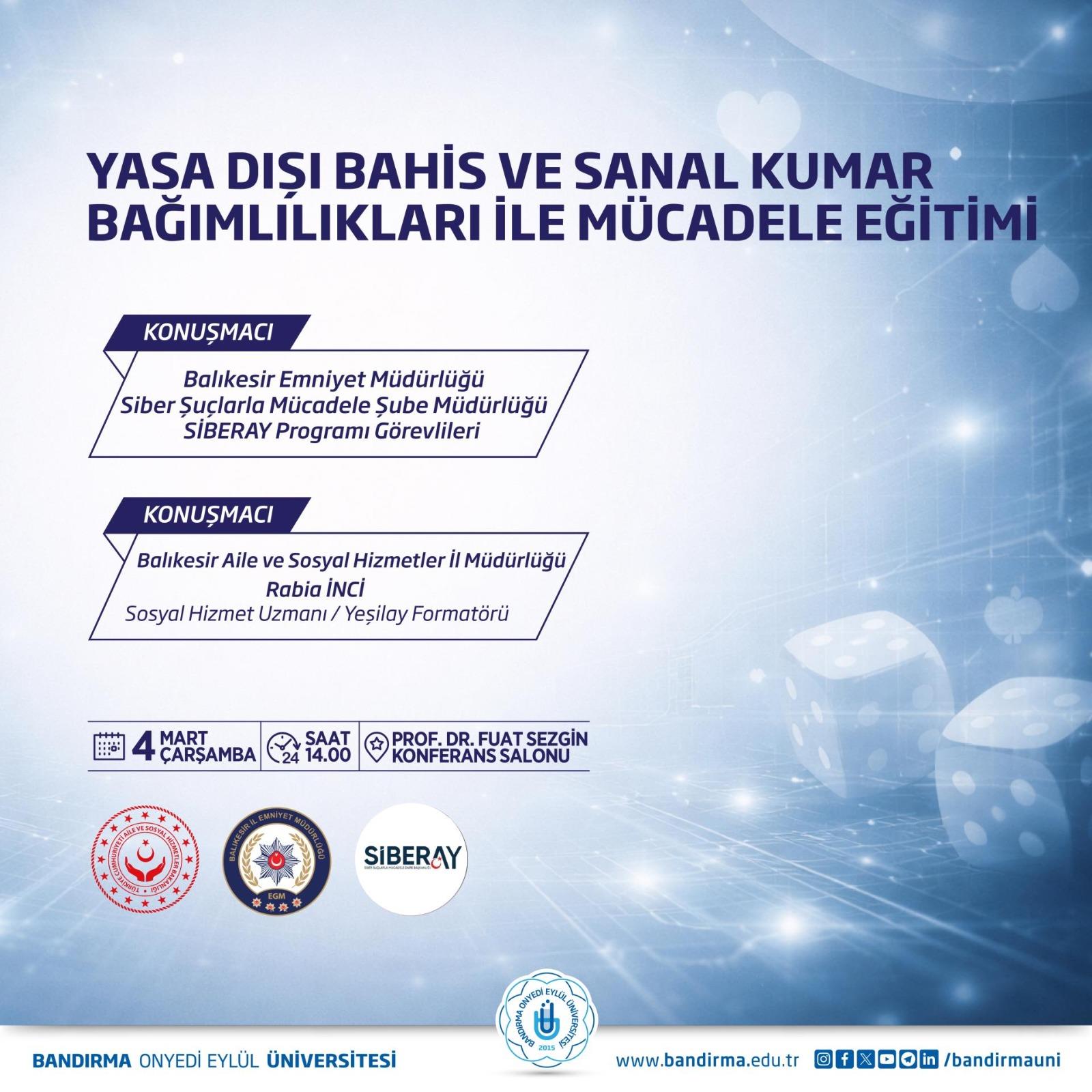 Balıkesir İl Emniyet Müdürlüğü Siber Suçlarla Mücadele Şube Müdürlüğü ve Balıkesir Aile ve Sosyal Hizmetler İl Müdürlüğü katkılarıyla, “Yasa Dışı Bahis ve Sanal Kumar Bağımlılıkları ile Mücadele Eğitimi” başlıklı bir eğitim düzenlenecektir.
