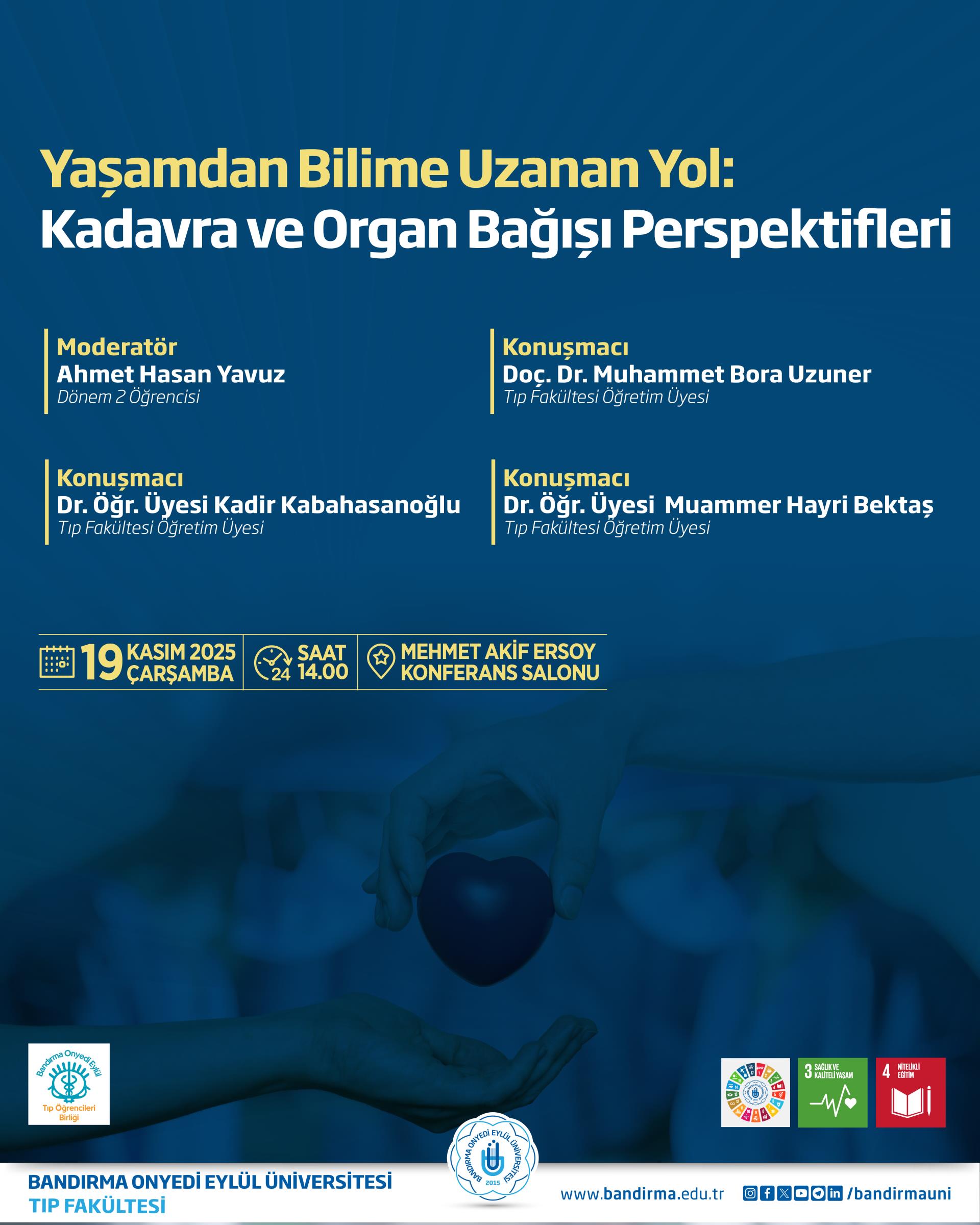 Tıp Fakültemiz tarafından, kadavra bağışı ve organ bağışının tıp eğitimindeki önemini ele almak amacıyla “Yaşamdan Bilime Uzanan Yol: Kadavra ve Organ Bağışı Perspektifleri” başlıklı bir konferans düzenlenecektir.