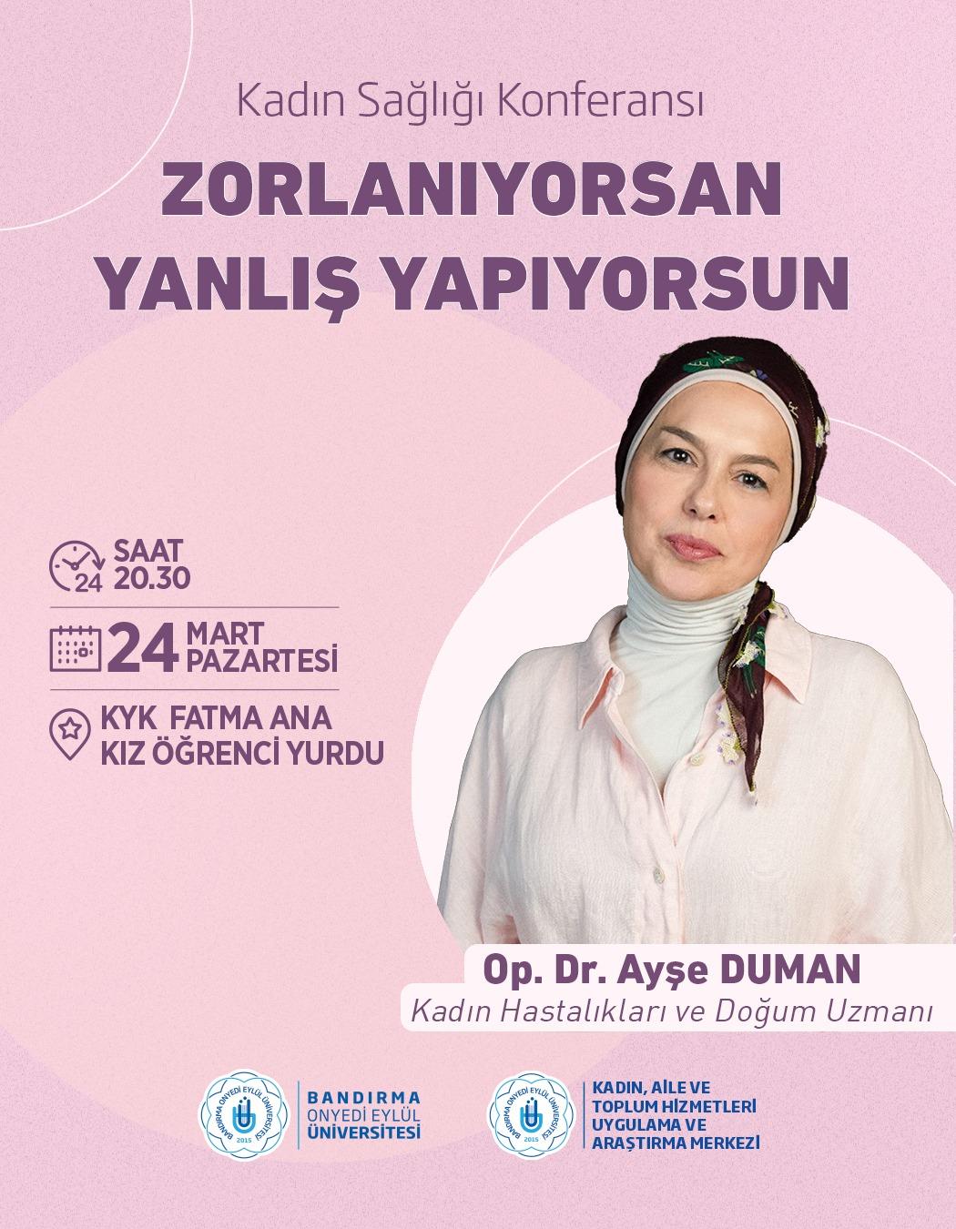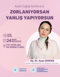 KYK Fatma Ana Kız Öğrenci Yurdu'nda düzenlenecek olan konferansa, Kadın Hastalıkları ve Doğum Uzmanı Op. Dr. Ayşe Duman konuşmacı olarak katılım sağlayacaktır.