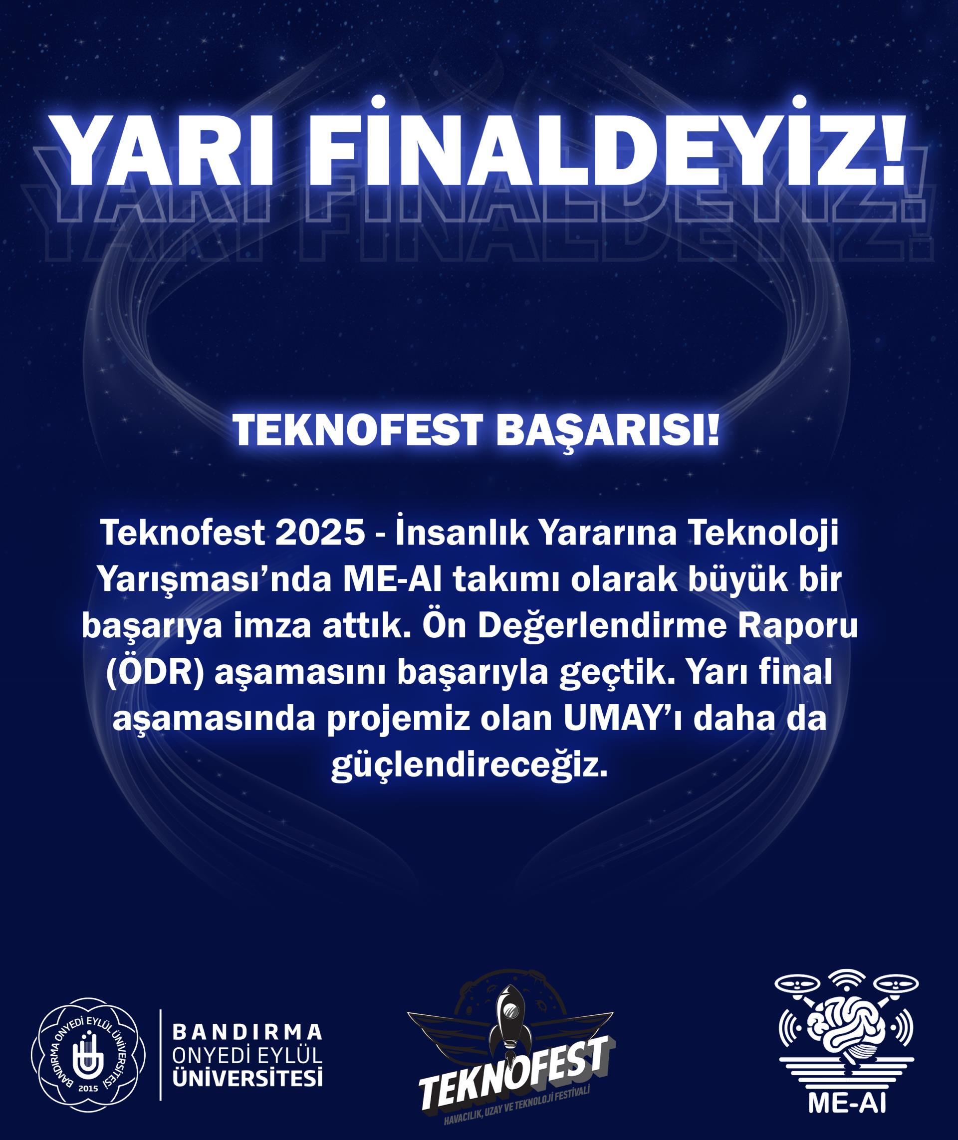 Bandırma Onyedi Eylül Üniversitesi öğrencileri tarafından geliştirilen “Umay – Yapay Zeka Destekli Afet Arama Kurtarma Drone Sistemi” projesi, TEKNOFEST 2025 kapsamında düzenlenen Afet Yönetimi kategorisinde yarı finale yükselmiştir!