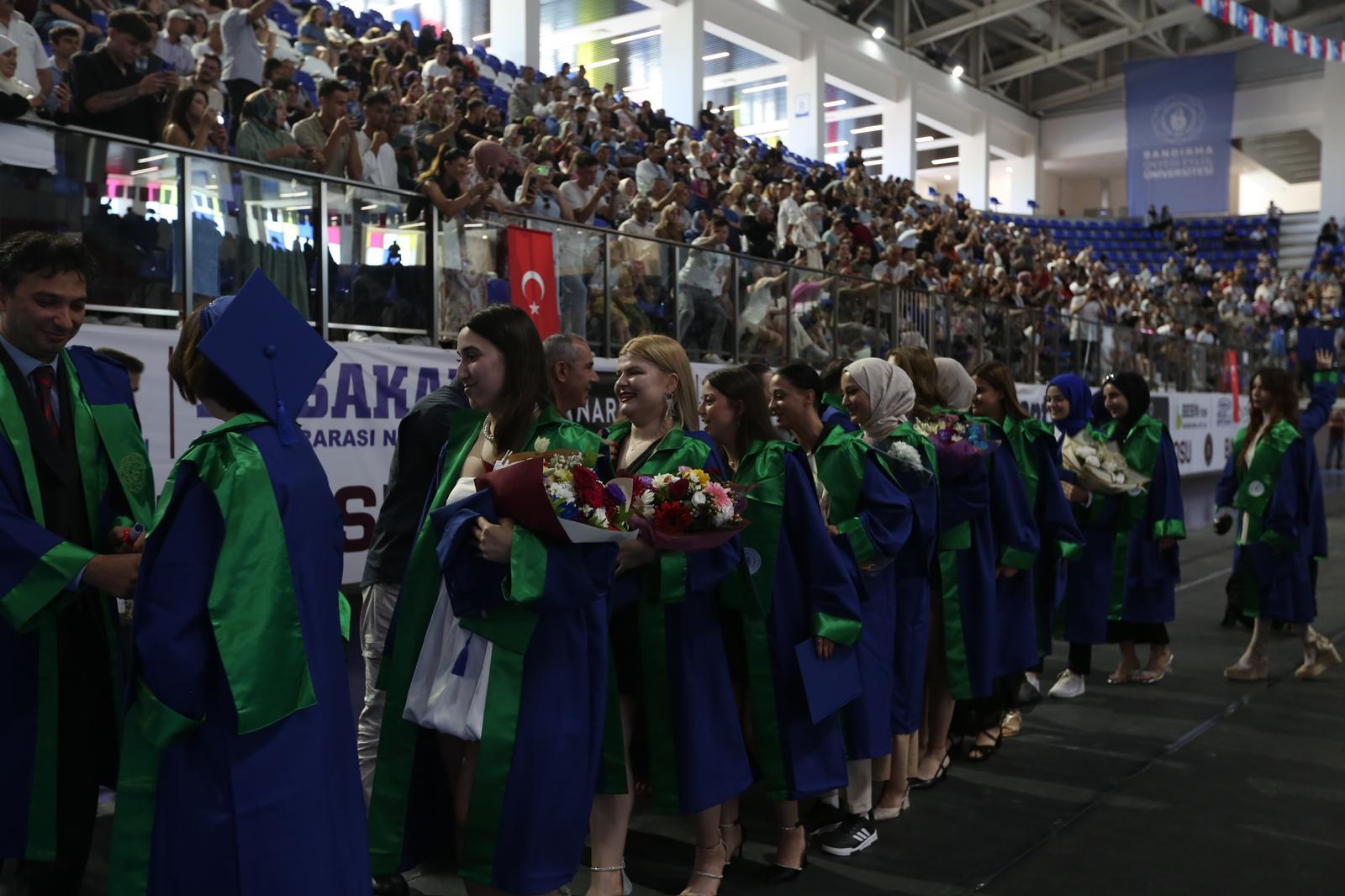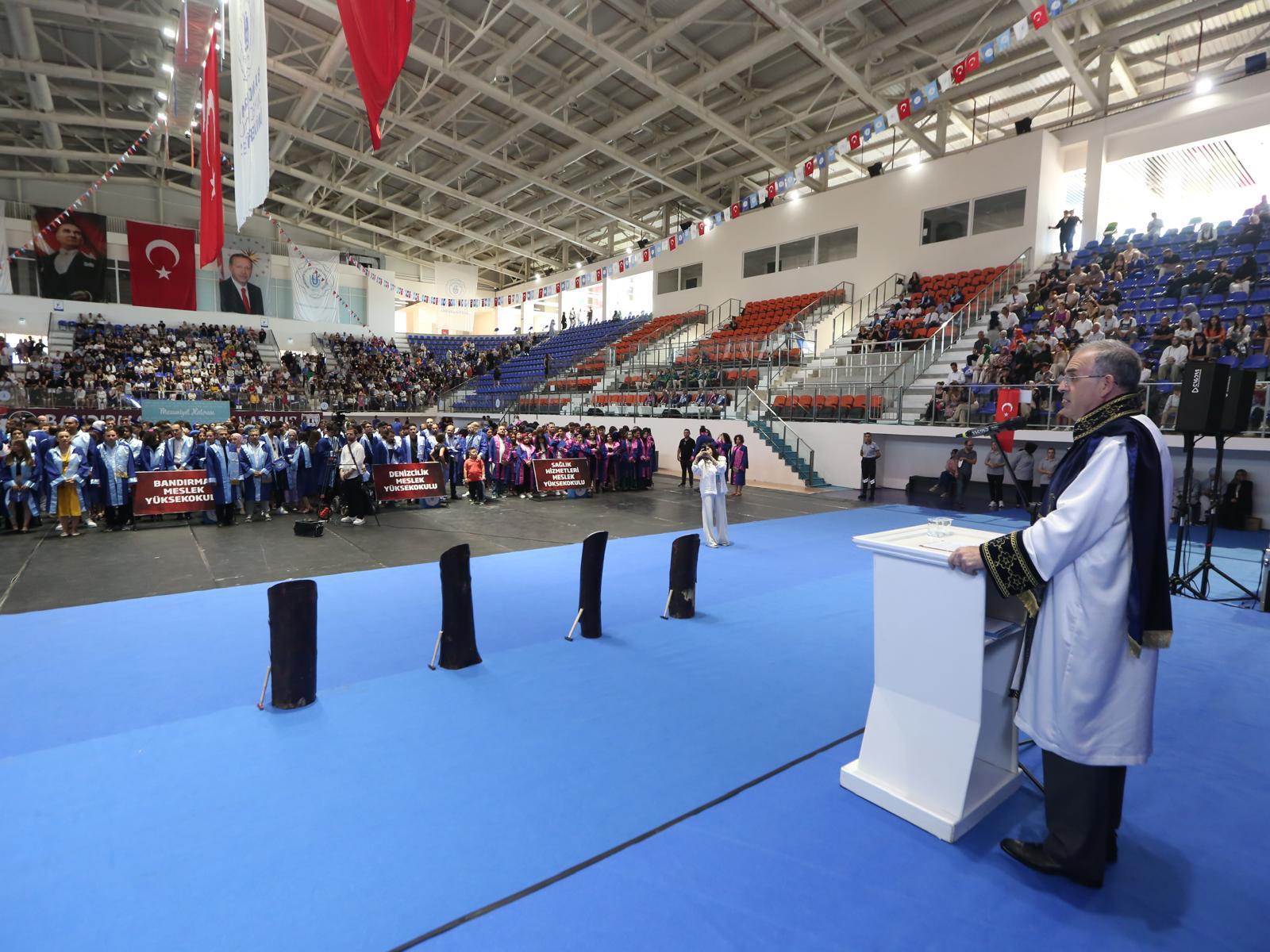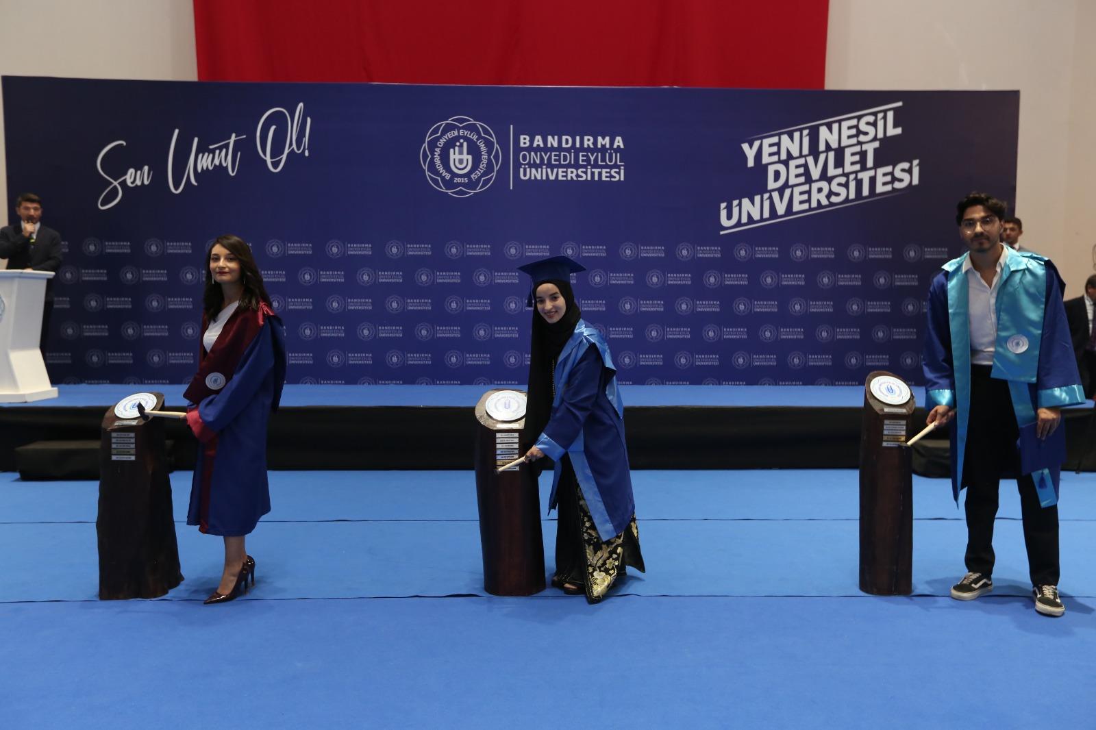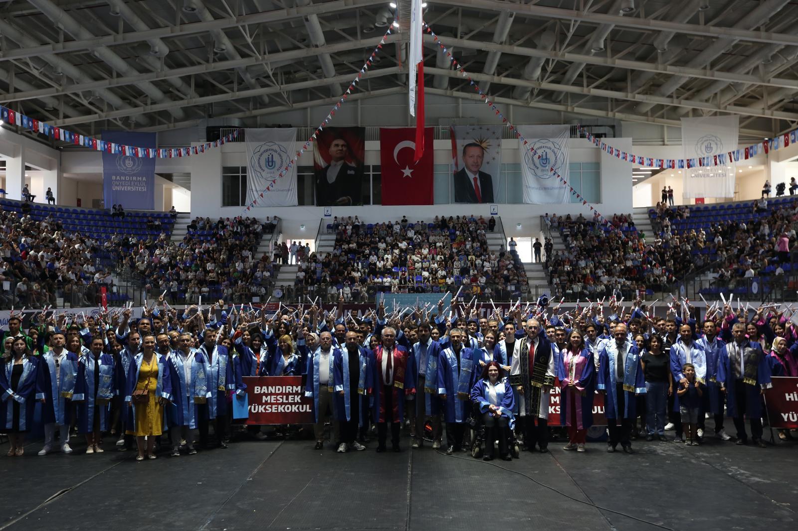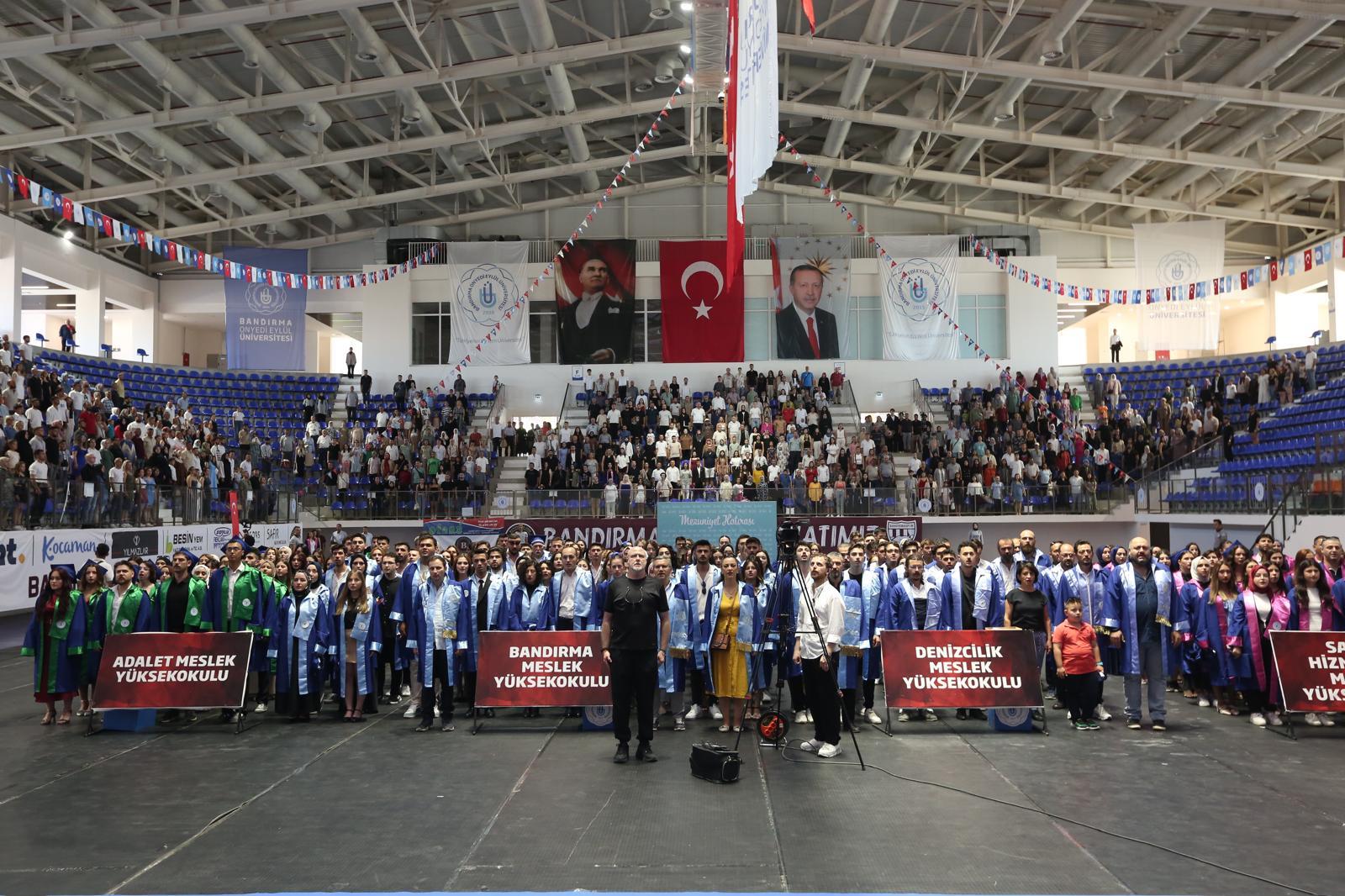 Mezuniyet törenlerimizin ilki; Adalet Meslek Yüksekokulu, Bandırma Meslek Yüksekokulu, Denizcilik Meslek Yüksekokulu ve Sağlık Hizmetleri Meslek Yüksekokulu mezunlarımıza yönelik düzenlenen mezuniyet töreni oldu. Saygı duruşu ve İstiklal Marşımızın okunmasıyla başlayan törende Rektörümüz Prof. Dr. İsmail Boz tarafından yapılan açış konuşmasının ardından Meslek Yüksekokullarımızı birincilikle bitiren öğrencilerimizin tüm mezunlar adına kütüğe plaket çakma seremonisi gerçekleşti. Seremoninin ardından Adalet Meslek Yüksekokulu Adalet Programı öğrencimiz Hatice Kara, mezun öğrencilerimiz adına bir konuşma gerçekleştirdi. Daha sonra dereceye giren öğrencilerimize başarı belgeleri ve tüm mezun öğrencilerimize mezuniyet anı belgelerinin takdim edildi. Tören, mezun öğrencilerin keplerini havaya atması ve mezuniyet eğlencesinin ardından son buldu.