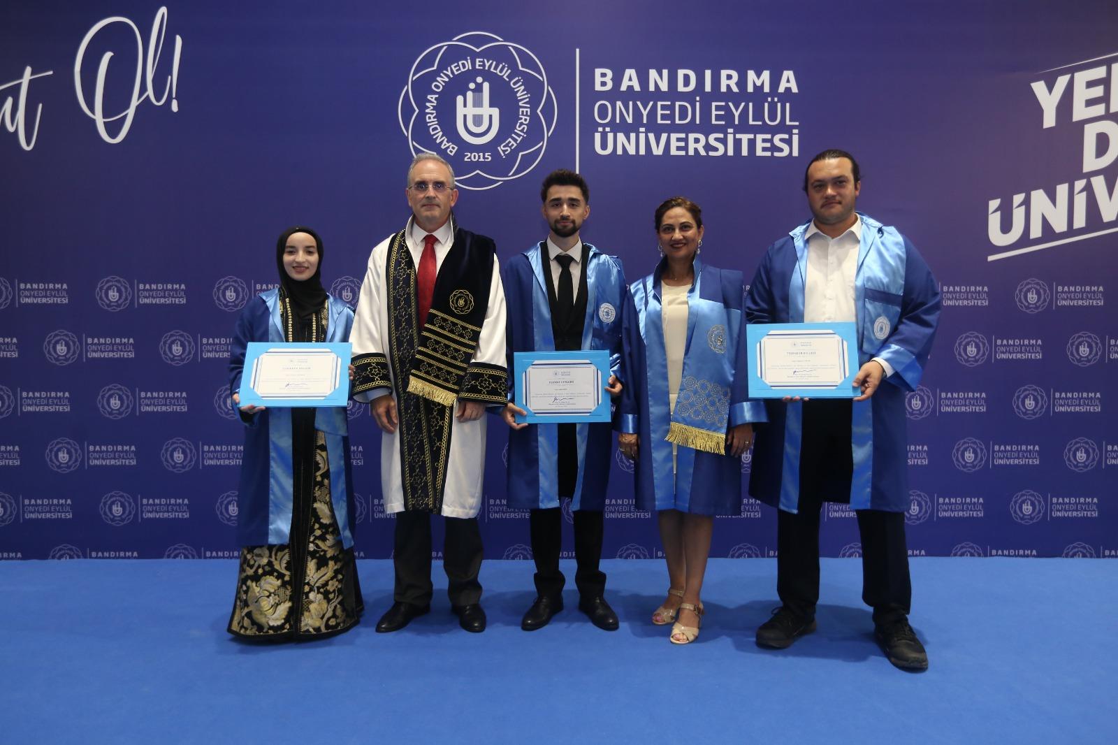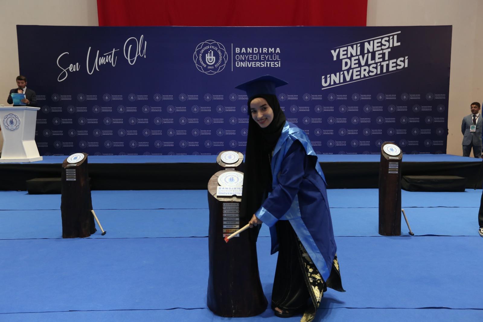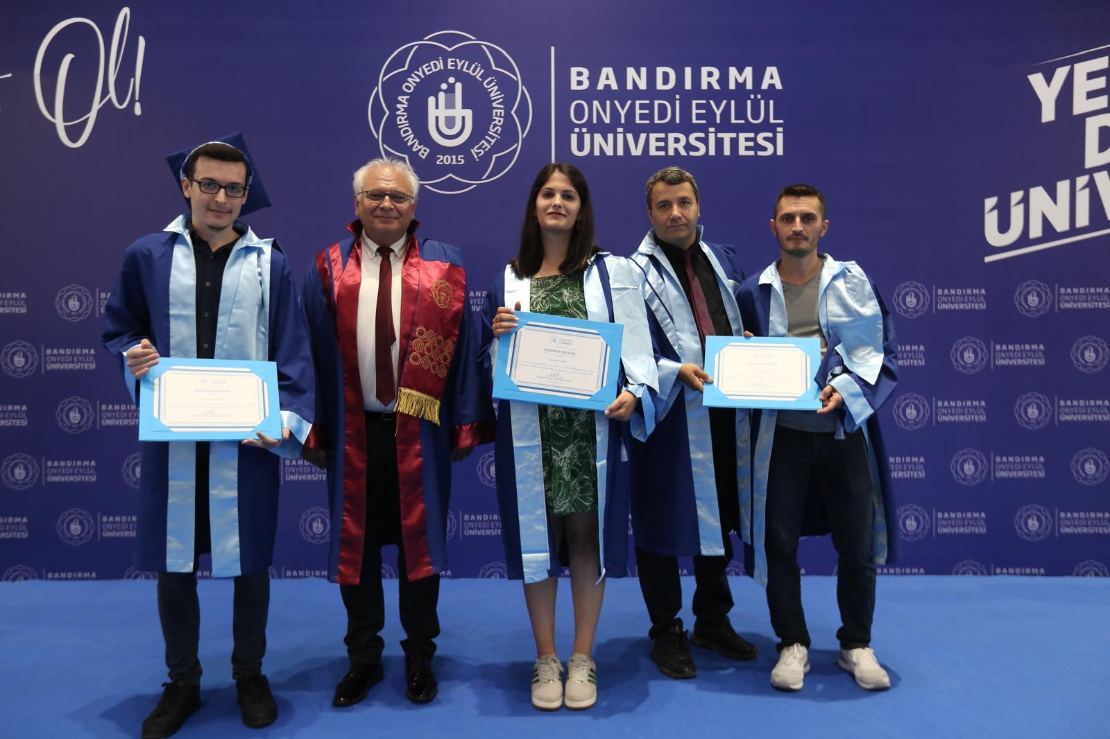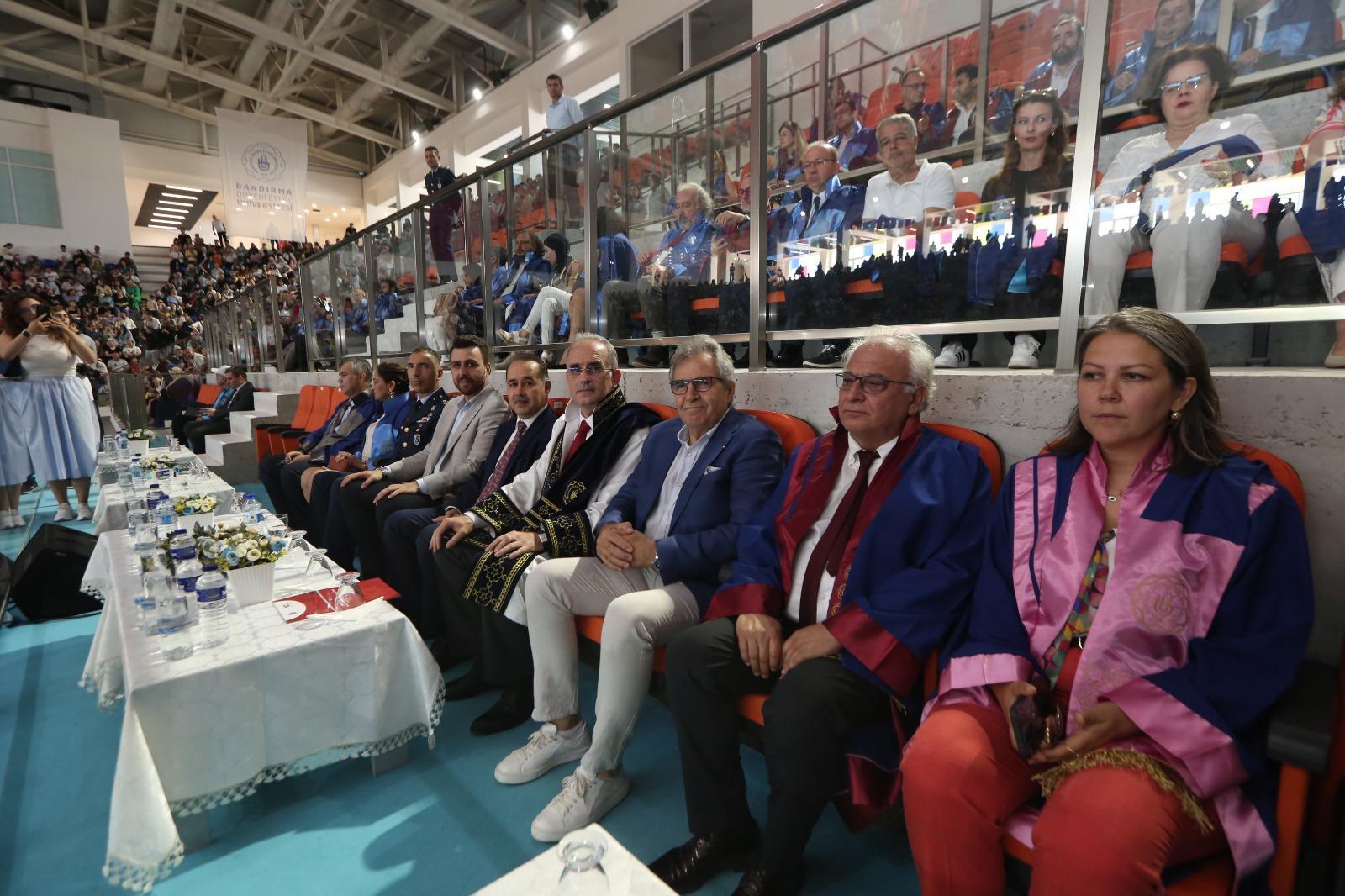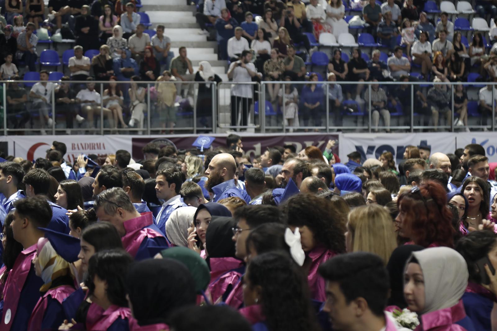 Mezuniyet törenlerimizin ilki; Adalet Meslek Yüksekokulu, Bandırma Meslek Yüksekokulu, Denizcilik Meslek Yüksekokulu ve Sağlık Hizmetleri Meslek Yüksekokulu mezunlarımıza yönelik düzenlenen mezuniyet töreni oldu. Saygı duruşu ve İstiklal Marşımızın okunmasıyla başlayan törende Rektörümüz Prof. Dr. İsmail Boz tarafından yapılan açış konuşmasının ardından Meslek Yüksekokullarımızı birincilikle bitiren öğrencilerimizin tüm mezunlar adına kütüğe plaket çakma seremonisi gerçekleşti. Seremoninin ardından Adalet Meslek Yüksekokulu Adalet Programı öğrencimiz Hatice Kara, mezun öğrencilerimiz adına bir konuşma gerçekleştirdi. Daha sonra dereceye giren öğrencilerimize başarı belgeleri ve tüm mezun öğrencilerimize mezuniyet anı belgelerinin takdim edildi. Tören, mezun öğrencilerin keplerini havaya atması ve mezuniyet eğlencesinin ardından son buldu.