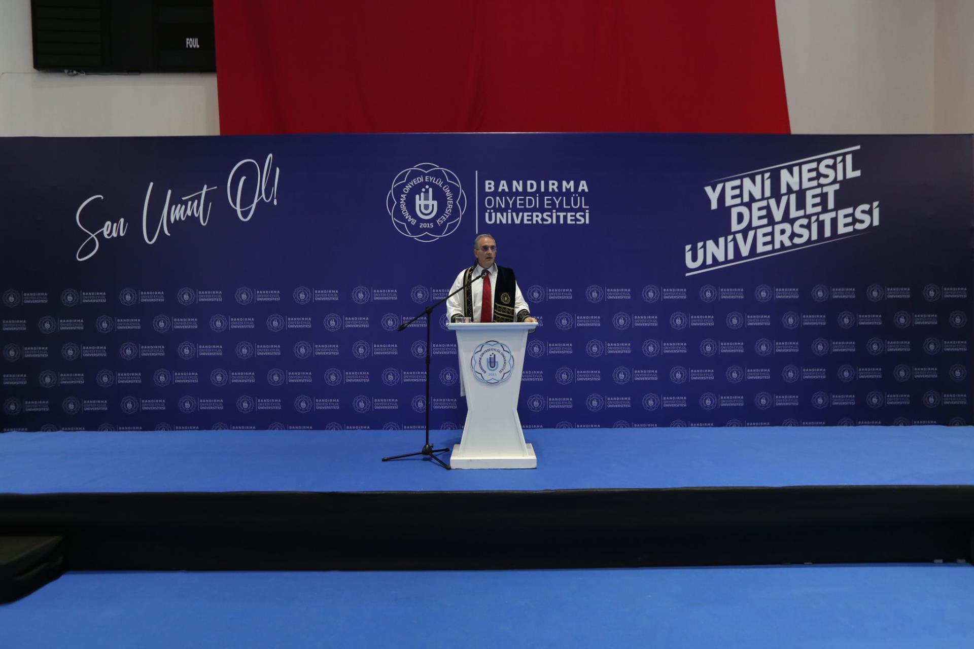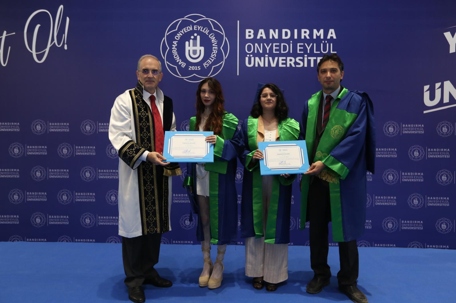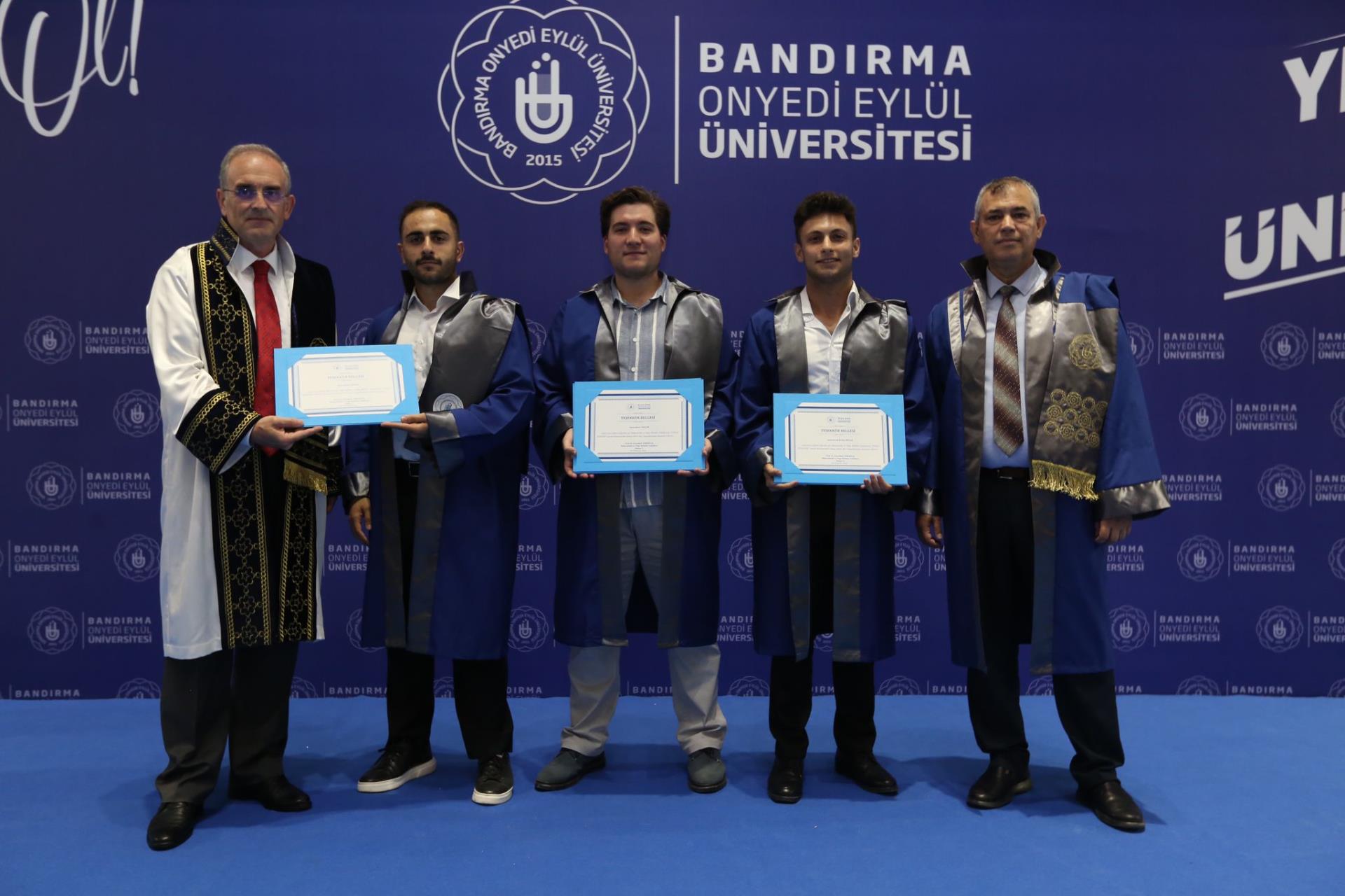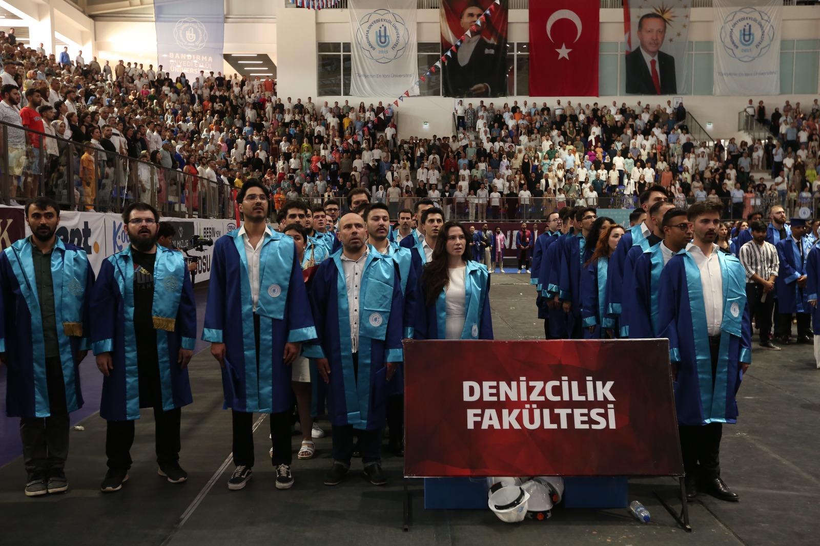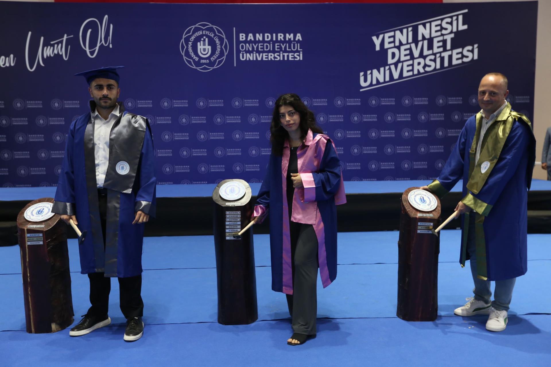 Mezuniyet törenlerimizin ilki; Adalet Meslek Yüksekokulu, Bandırma Meslek Yüksekokulu, Denizcilik Meslek Yüksekokulu ve Sağlık Hizmetleri Meslek Yüksekokulu mezunlarımıza yönelik düzenlenen mezuniyet töreni oldu. Saygı duruşu ve İstiklal Marşımızın okunmasıyla başlayan törende Rektörümüz Prof. Dr. İsmail Boz tarafından yapılan açış konuşmasının ardından Meslek Yüksekokullarımızı birincilikle bitiren öğrencilerimizin tüm mezunlar adına kütüğe plaket çakma seremonisi gerçekleşti. Seremoninin ardından Adalet Meslek Yüksekokulu Adalet Programı öğrencimiz Hatice Kara, mezun öğrencilerimiz adına bir konuşma gerçekleştirdi. Daha sonra dereceye giren öğrencilerimize başarı belgeleri ve tüm mezun öğrencilerimize mezuniyet anı belgelerinin takdim edildi. Tören, mezun öğrencilerin keplerini havaya atması ve mezuniyet eğlencesinin ardından son buldu.