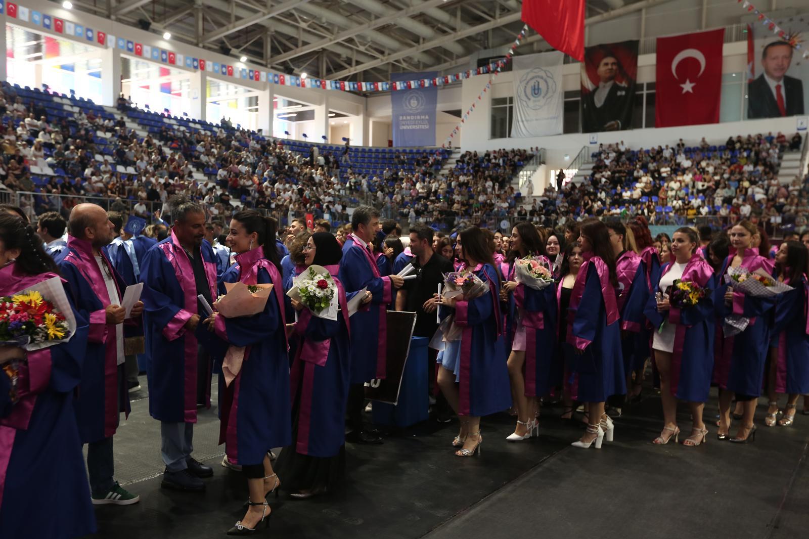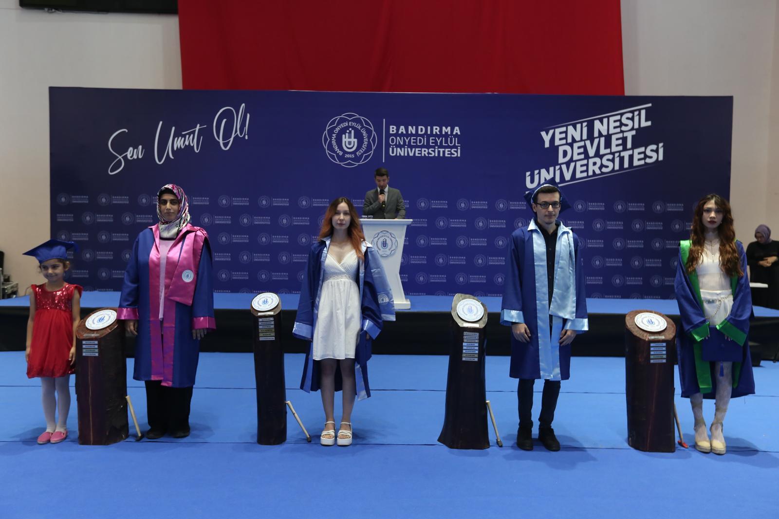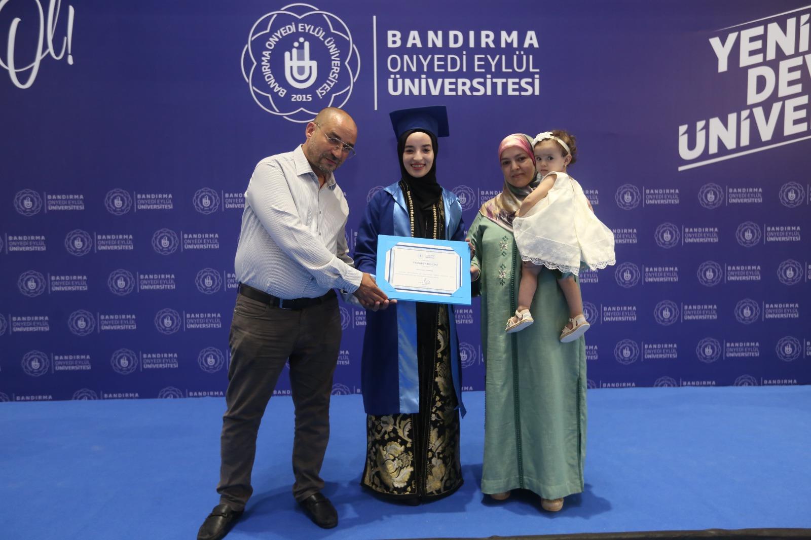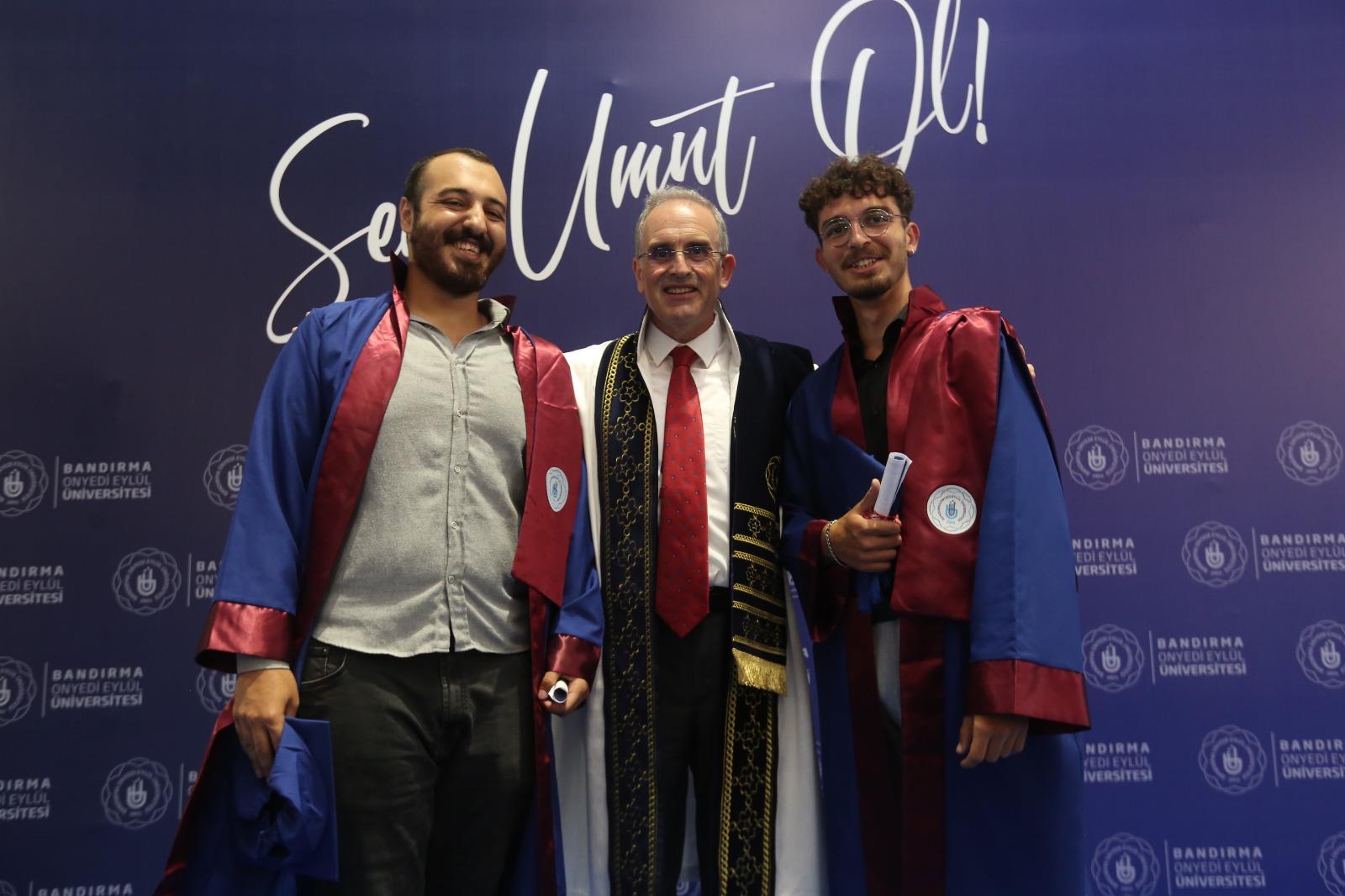 Mezuniyet törenlerimizin ilki; Adalet Meslek Yüksekokulu, Bandırma Meslek Yüksekokulu, Denizcilik Meslek Yüksekokulu ve Sağlık Hizmetleri Meslek Yüksekokulu mezunlarımıza yönelik düzenlenen mezuniyet töreni oldu. Saygı duruşu ve İstiklal Marşımızın okunmasıyla başlayan törende Rektörümüz Prof. Dr. İsmail Boz tarafından yapılan açış konuşmasının ardından Meslek Yüksekokullarımızı birincilikle bitiren öğrencilerimizin tüm mezunlar adına kütüğe plaket çakma seremonisi gerçekleşti. Seremoninin ardından Adalet Meslek Yüksekokulu Adalet Programı öğrencimiz Hatice Kara, mezun öğrencilerimiz adına bir konuşma gerçekleştirdi. Daha sonra dereceye giren öğrencilerimize başarı belgeleri ve tüm mezun öğrencilerimize mezuniyet anı belgelerinin takdim edildi. Tören, mezun öğrencilerin keplerini havaya atması ve mezuniyet eğlencesinin ardından son buldu.