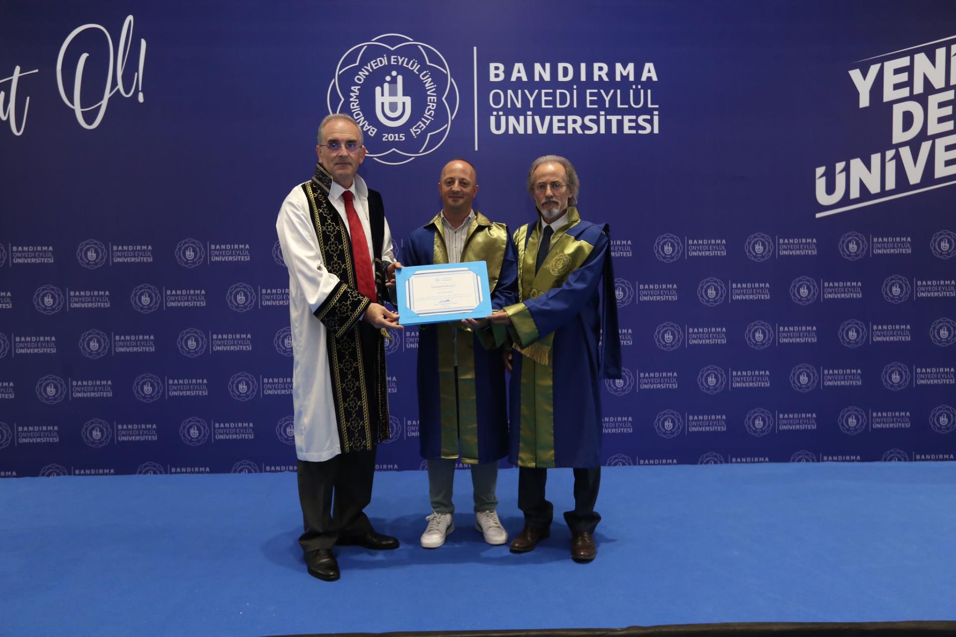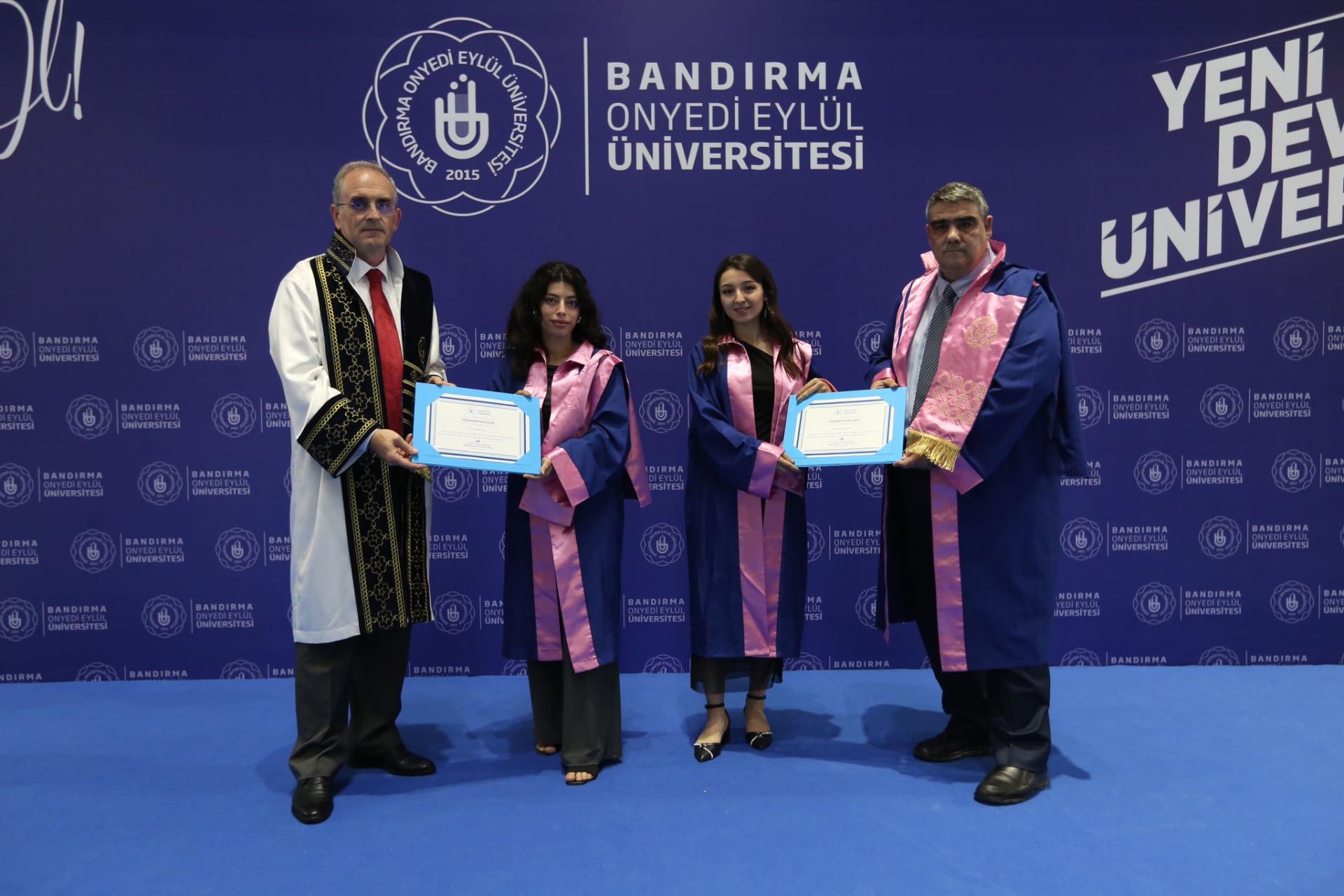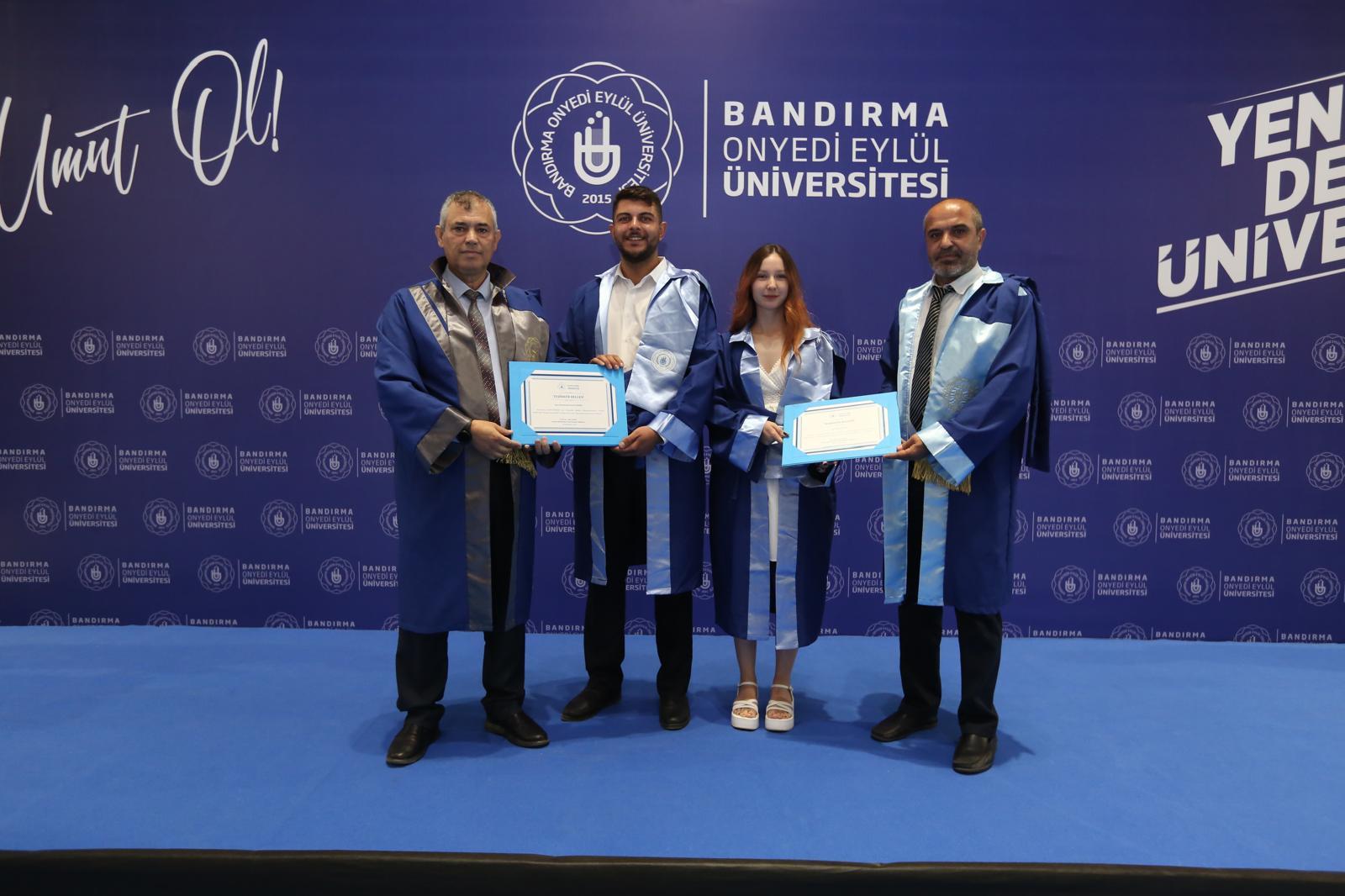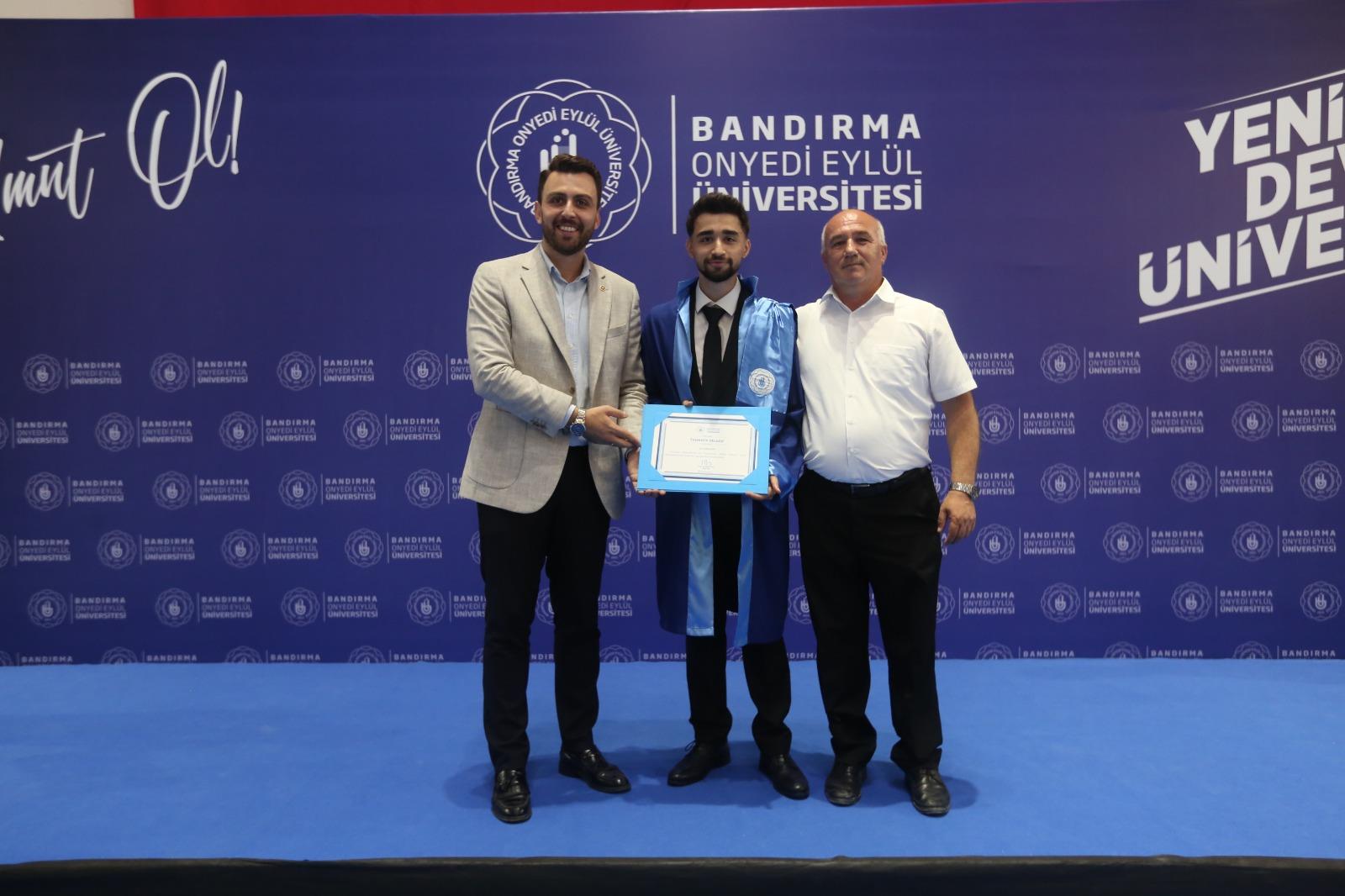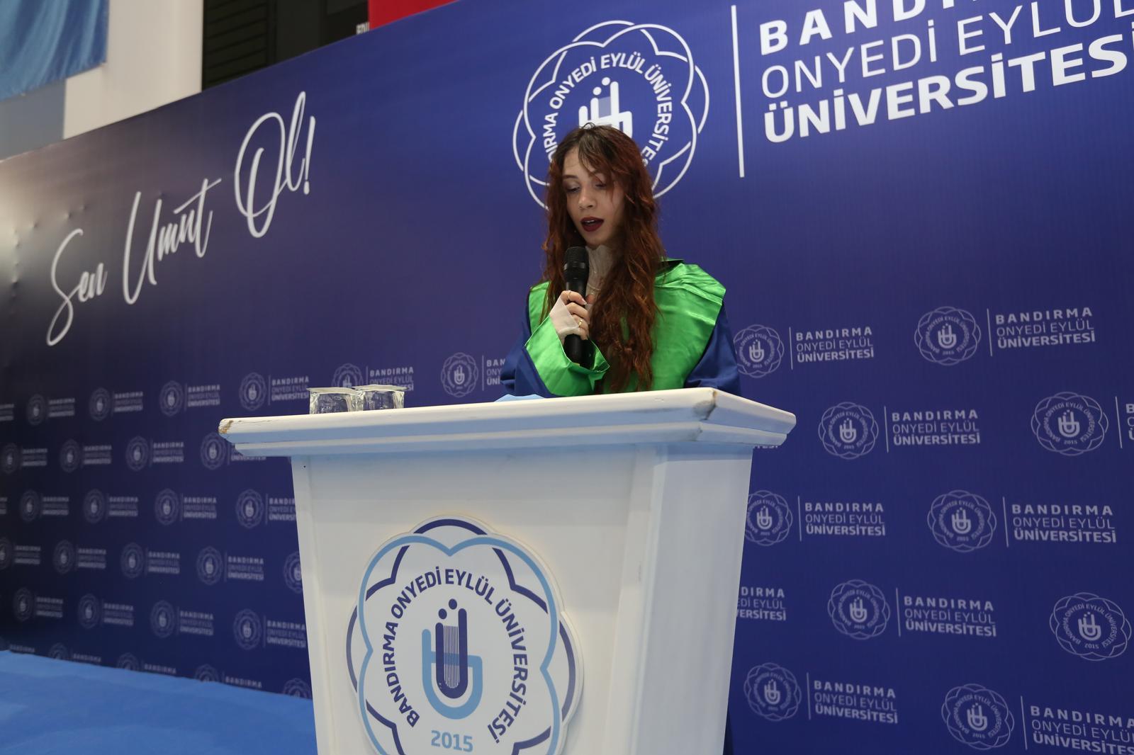 Mezuniyet törenlerimizin ilki; Adalet Meslek Yüksekokulu, Bandırma Meslek Yüksekokulu, Denizcilik Meslek Yüksekokulu ve Sağlık Hizmetleri Meslek Yüksekokulu mezunlarımıza yönelik düzenlenen mezuniyet töreni oldu. Saygı duruşu ve İstiklal Marşımızın okunmasıyla başlayan törende Rektörümüz Prof. Dr. İsmail Boz tarafından yapılan açış konuşmasının ardından Meslek Yüksekokullarımızı birincilikle bitiren öğrencilerimizin tüm mezunlar adına kütüğe plaket çakma seremonisi gerçekleşti. Seremoninin ardından Adalet Meslek Yüksekokulu Adalet Programı öğrencimiz Hatice Kara, mezun öğrencilerimiz adına bir konuşma gerçekleştirdi. Daha sonra dereceye giren öğrencilerimize başarı belgeleri ve tüm mezun öğrencilerimize mezuniyet anı belgelerinin takdim edildi. Tören, mezun öğrencilerin keplerini havaya atması ve mezuniyet eğlencesinin ardından son buldu.