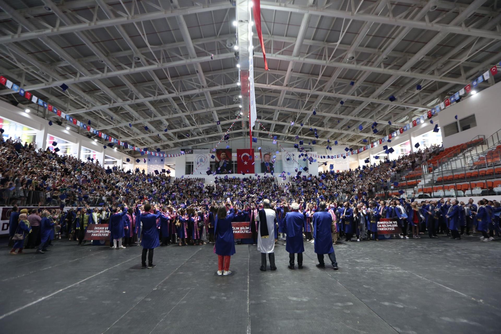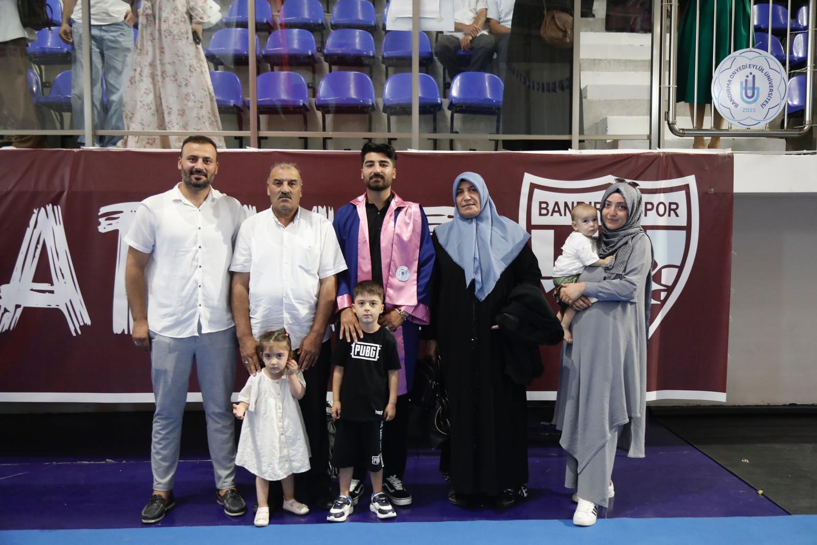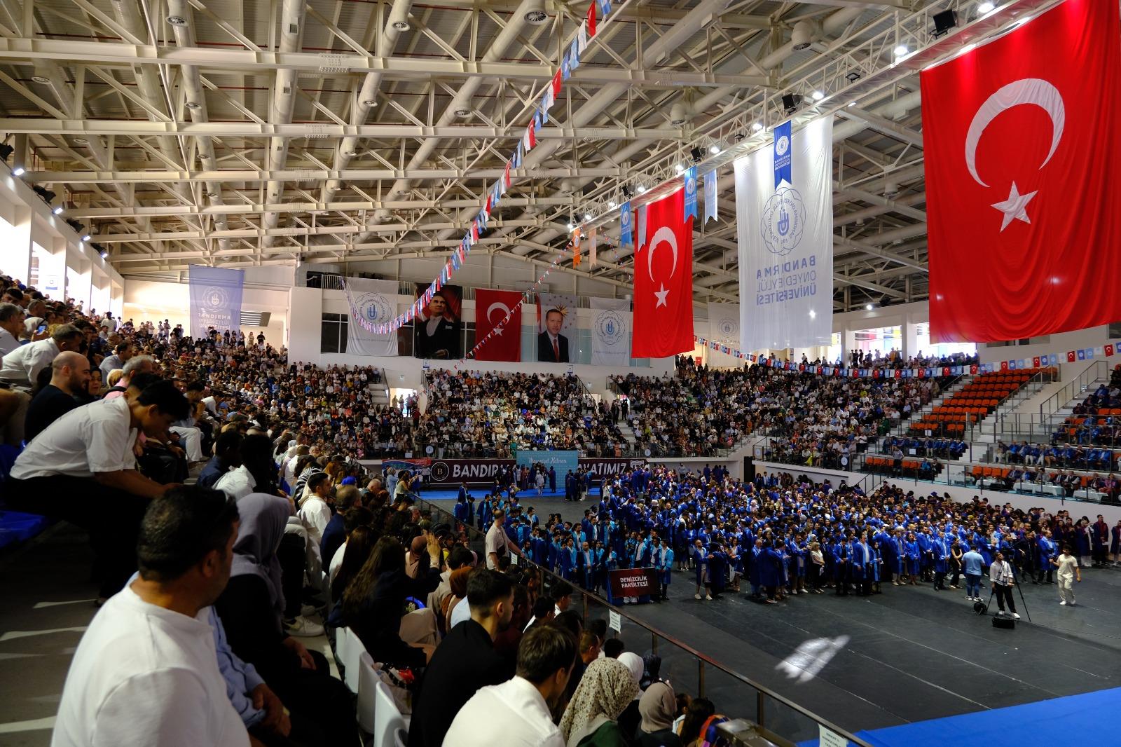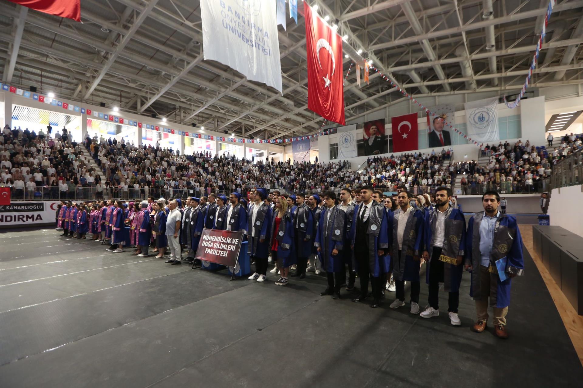 Üniversitemiz 2023-2024 Eğitim-Öğretim Yılı Lisans ve Önlisans mezunlarına yönelik düzenlenen mezuniyet törenlerimiz büyük bir coşkuyla gerçekleşti. Mezun olan öğrencilerimiz, diploma sevincini aileleri ve sevdikleriyle paylaşmanın mutluluğunu yaşadılar. BANÜ Spor Vadisi Kapalı Spor Salonu’nda üç ayrı program olarak düzenlenen mezuniyet törenlerinde öğrencilerimiz, uzun bir eğitim maratonunun ardından kazandıkları başarıları, kıymetli aileleri ve akademik/idari kadromuzla birlikte kutladılar. Mezuniyet törenleri sonunda ülkemizin umudu, istikbalimizin parlayan yıldızları gençlerimizi yeni hayatlarına uğurladık.
