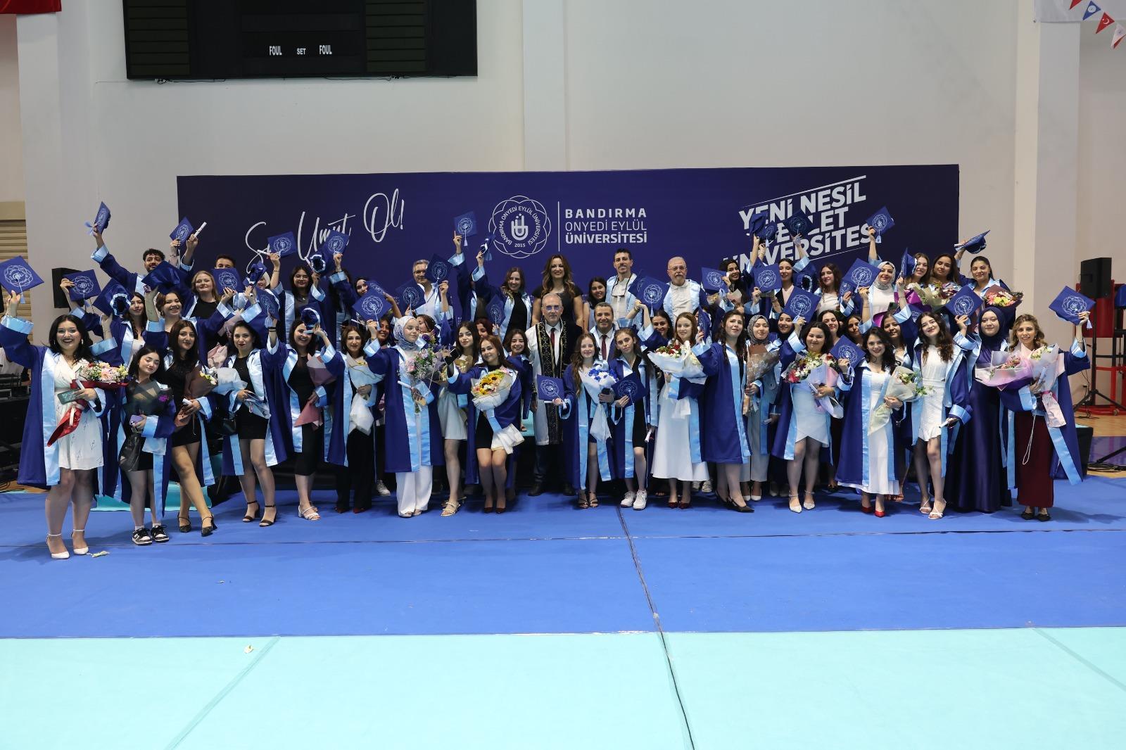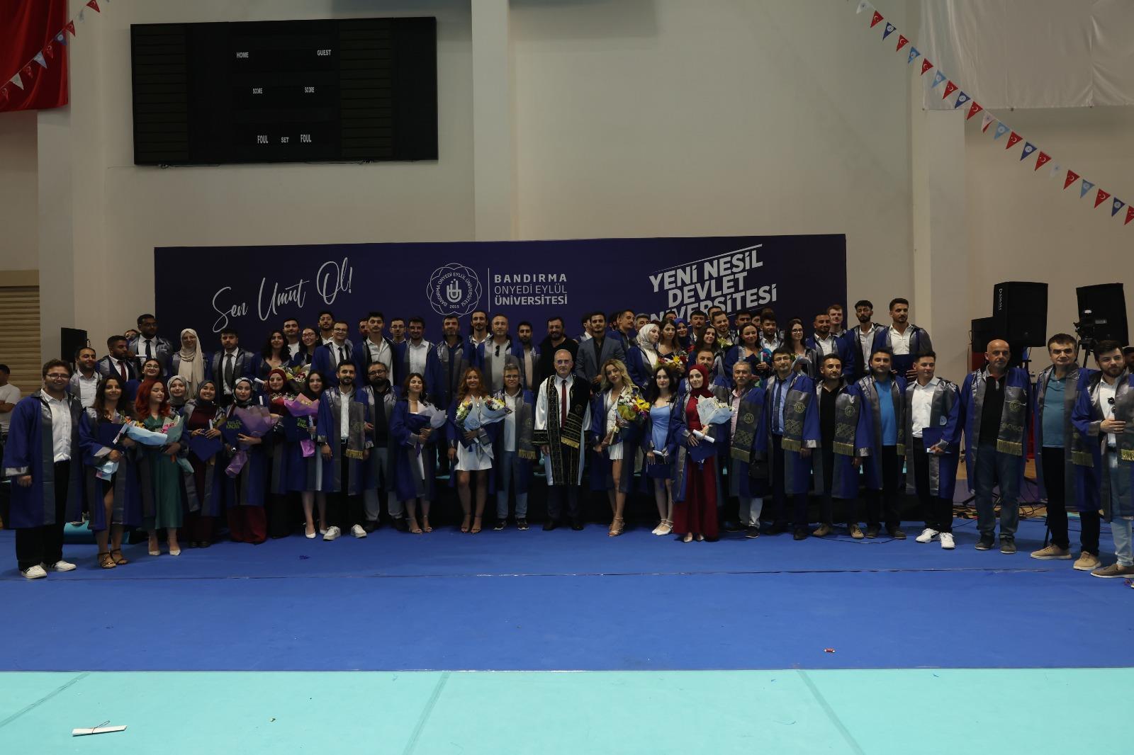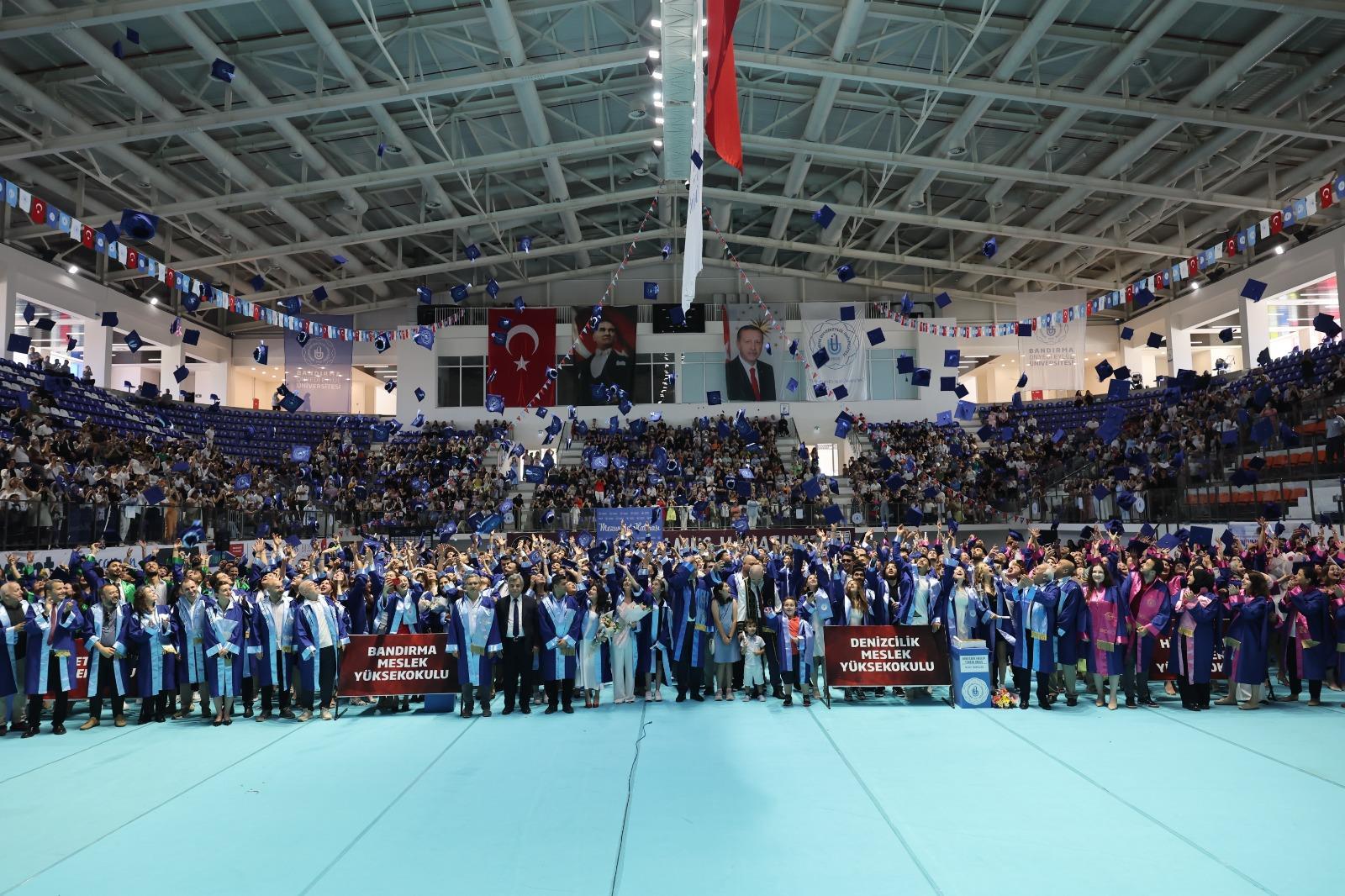 Mezuniyet törenlerimizin ilki; Adalet Meslek Yüksekokulu, Bandırma Meslek Yüksekokulu, Denizcilik Meslek Yüksekokulu ve Sağlık Hizmetleri Meslek Yüksekokulu mezunlarımıza yönelik düzenlenen mezuniyet töreni oldu. Saygı duruşu ve İstiklal Marşımızın okunmasıyla başlayan törene Rektörümüz Prof. Dr. İsmail Boz, Rektör Yardımcılarımız Prof. Dr. Alpaslan Serel ve Prof. Dr. Mehmet Emin Erçakar, Genel Sekreterimiz Cihangir Boz, akademik ve idari personelimiz, öğrencilerimizin kıymetli aileleri ve basın mensupları katıldı. Tören, Rektörümüz Prof. Dr. İsmail Boz tarafından yapılan açılış konuşmasıyla başladı. Konuşmasında “Ne yaparsanız yapın, iyi bir insan olmaktan vazgeçmeyin.” diyen Rektörümüz Prof. Dr. İsmail Boz, tüm öğrencilerimizin mezuniyetini kutlayarak gelecek yaşamlarında başarılar diledi. Açılış konuşmasının ardından Meslek Yüksekokullarımızı birincilikle bitiren öğrencilerimizin tüm mezunlar adına kütüğe plaket çakma seremonisi gerçekleşti. Seremoninin ardından Adalet Meslek Yüksekokulu Ceza İnfaz ve Güvenlik Hizmetleri Programı öğrencimiz Fatma Zehra Gündoğan tüm mezun öğrencilerimiz adına anlamlı bir konuşma yaptı. Daha sonra dereceye giren öğrencilerimize başarı belgeleri ve tüm mezun öğrencilerimize mezuniyet anı belgelerinin takdim edildi. Tören, mezun öğrencilerin keplerini havaya atması ve mezuniyet eğlencesinin ardından son buldu.