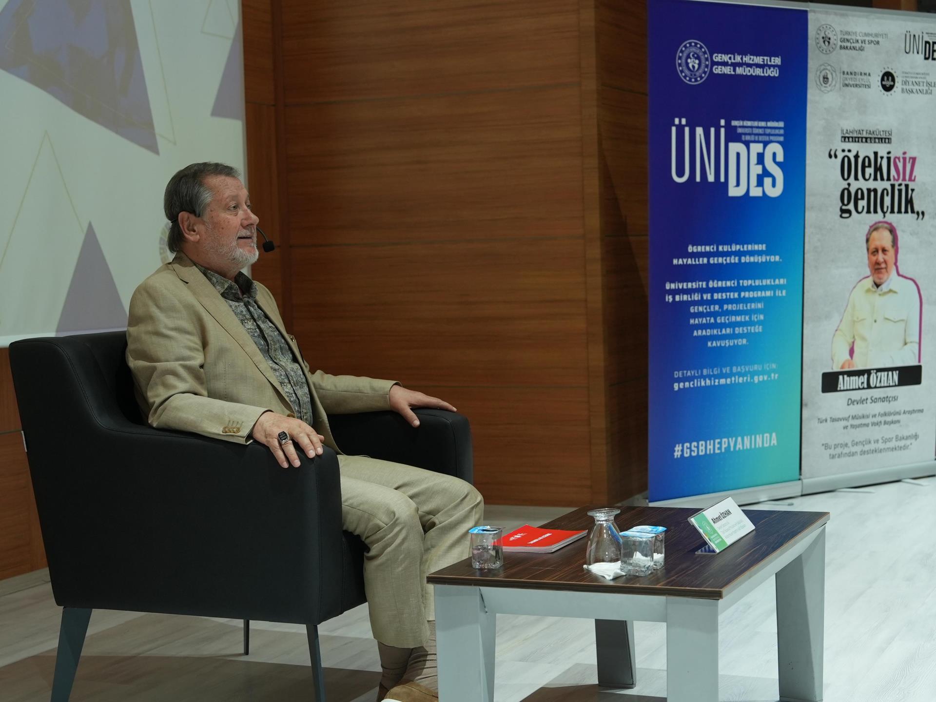 Söyleşide gençlerle buluşan Ahmet Özhan, toplumsal dayanışma, birlik ve beraberlik vurgusu yaparak: “Gençlerimiz sıkışmasın bir yerde, insanın kendini aşması lazım. Ötekileştirmeden, ‘ben-sen’ veya ‘benim-senin’ demeden, biz diyerek hayatı yaşamalıyız ve anlamlandırmalıyız.” dedi. Demokrasi ve insan hakları kavramlarını kendi çıkarları doğrultusunda kullanan bazı ülkelerin, aslında bu değerleri samimi bir şekilde savunmadıklarını ifade eden Özhan, gençleri bu tür manipülasyonlara karşı bilinçli olmaya davet etti.