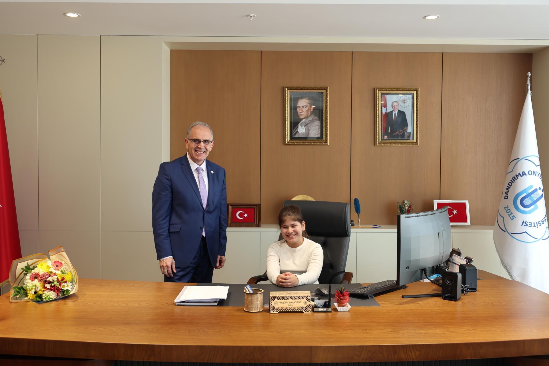 23 Nisan Ulusal Egemenlik ve Çocuk Bayramı dolayısıyla Bandırma Doğa Koleji öğrencileri, Bandırma Doğa Koleji Müdürü Merve Yaman ve İlkokul Müdürü Yavuz Yuvalı eşliğinde Rektörümüz Prof. Dr. İsmail Boz’u makamında ziyaret etti. Neşeli ve anlamlı buluşmada öğrenciler, temsili olarak rektörlük koltuğuna oturarak bayramın coşkusunu yaşadı.