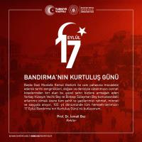 Bu duygu ve düşüncelerle başta Gazi Mustafa Kemal Atatürk ile canı pahasına mücadele ederek tarihi zenginlikleri, doğası ve deniziyle vatanımızın cennet köşelerinden biri olan bu güzel şehri bizlere armağan eden Yarbay Hüseyin Vecihi Bey ve Binbaşı Süleyman Bey komutasındaki kahraman erlerimiz olmak üzere tüm şehit ve gazilerimizi rahmet, minnet ve saygıyla anıyor, 102. yıl dönümünde tüm hemşerilerimizin 17 Eylül Bandırma’nın Kurtuluş Gününü kutluyorum.