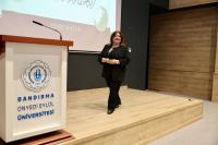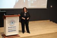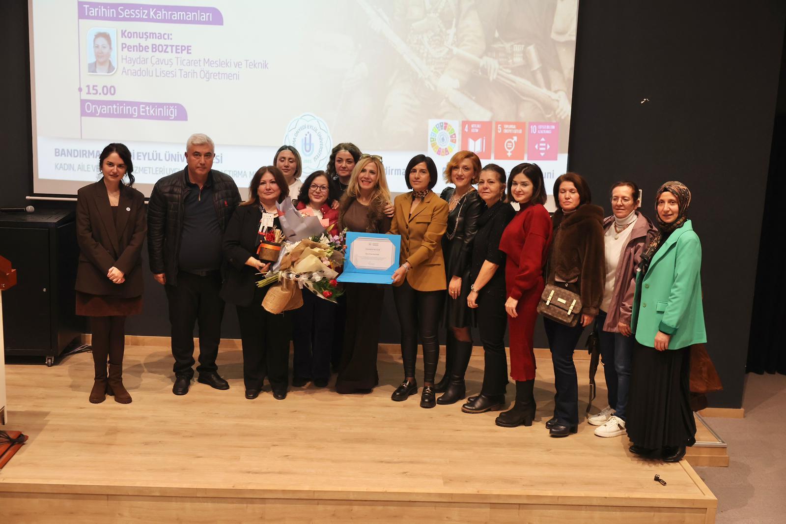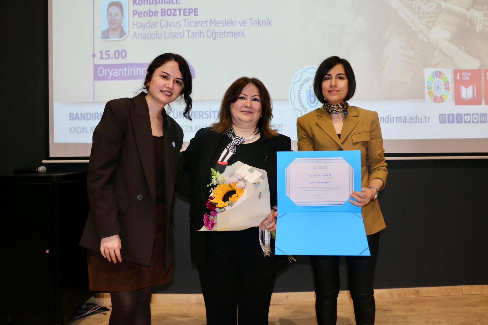 Söyleşinin sonunda Kadın Aile ve Toplum Hizmetleri Uygulama ve Araştırma Merkezi Müdürü Doç. Dr. Zeynep Aca ve Müdür Yardımcısı Dr. Öğr. Üyesi Gizem Burcu Karaali tarafından Penbe Boztepe’ye çiçek ve teşekkür belgesi takdim edildi.