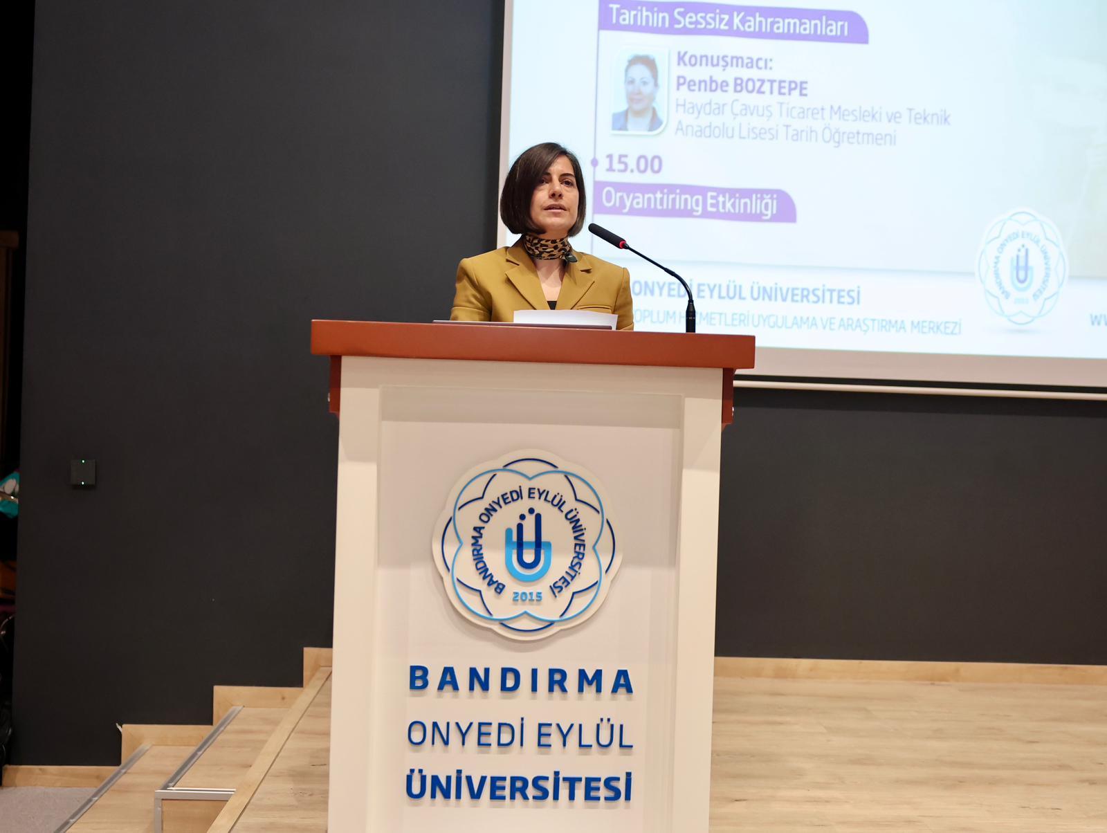 Necip Fazıl Kısakürek Salonunda gerçekleştirilen söyleşiye Haydar Çavuş Ticaret Mesleki ve Teknik Anadolu Lisesi Tarih Öğretmeni Penbe Boztepe konuşmacı olarak katıldı. Söyleşide, Nilüfer Hatun, Hürrem Sultan, Bezmiâlem Valide Sultan, Zeynep Kamil, Kara Fatma, Nene Hatun ve Müfide Kadri gibi tarih boyunca toplumsal dönüşüme katkı sunmuş kadınların yaşamlarını ve rollerini ele alındı.