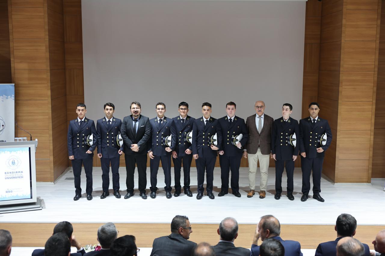 Törenin açılış konuşmasını Denizcilik Fakültesi Dekanımız Prof. Dr. Celil Aydın gerçekleştirdi. Daha sonra denizcilik camiasının önde gelen isimlerinden İMEAK Deniz Ticaret Odası Yönetim Kurulu Başkanı Tamer Kıran bir konuşma gerçekleştirdi. Konuşmasında denizcilik mesleğinin disiplin, sorumluluk ve aidiyet duygusu gerektiren bir yaşam biçimi olduğuna dikkat çeken Kıran, sektörel deneyimlerini paylaşarak, öğrencilere denizciliğin Türkiye açısından taşıdığı stratejik önemi hatırlattı. Rektörümüz Prof. Dr. İsmail Boz ise selamlama konuşmasında, Üniversitemizin denizcilik eğitimine verdiği önemi vurgulayarak, fakültemizin güçlü altyapısı ve donanımlı akademik kadrosu ile sektöre nitelikli insan kaynağı yetiştirdiğini belirtti.