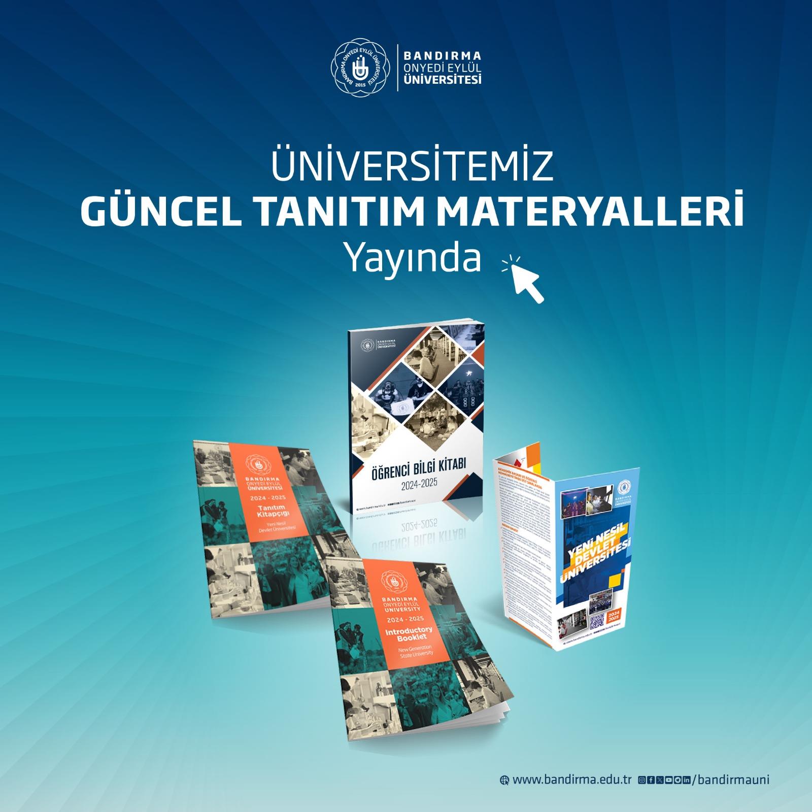 Üniversitemizin Fakülte, Enstitü, Yüksekokul bilgileri ile sosyal, kültürel ve sportif olanakları, tarihİ geçmişi ve sair diğer bilgilerin yer aldığı Bandırma Onyedi Eylül Üniversitesi Tanıtım Broşürü, Tanıtım Kitapçığı (Türkçe/İngilizce) ve Öğrenci Bilgi Kitabı siz değerli öğrencilerimizin istifade etmeleri için güncellenerek Üniversitemizin kurumsal web sayfasından yayınlanmıştır.