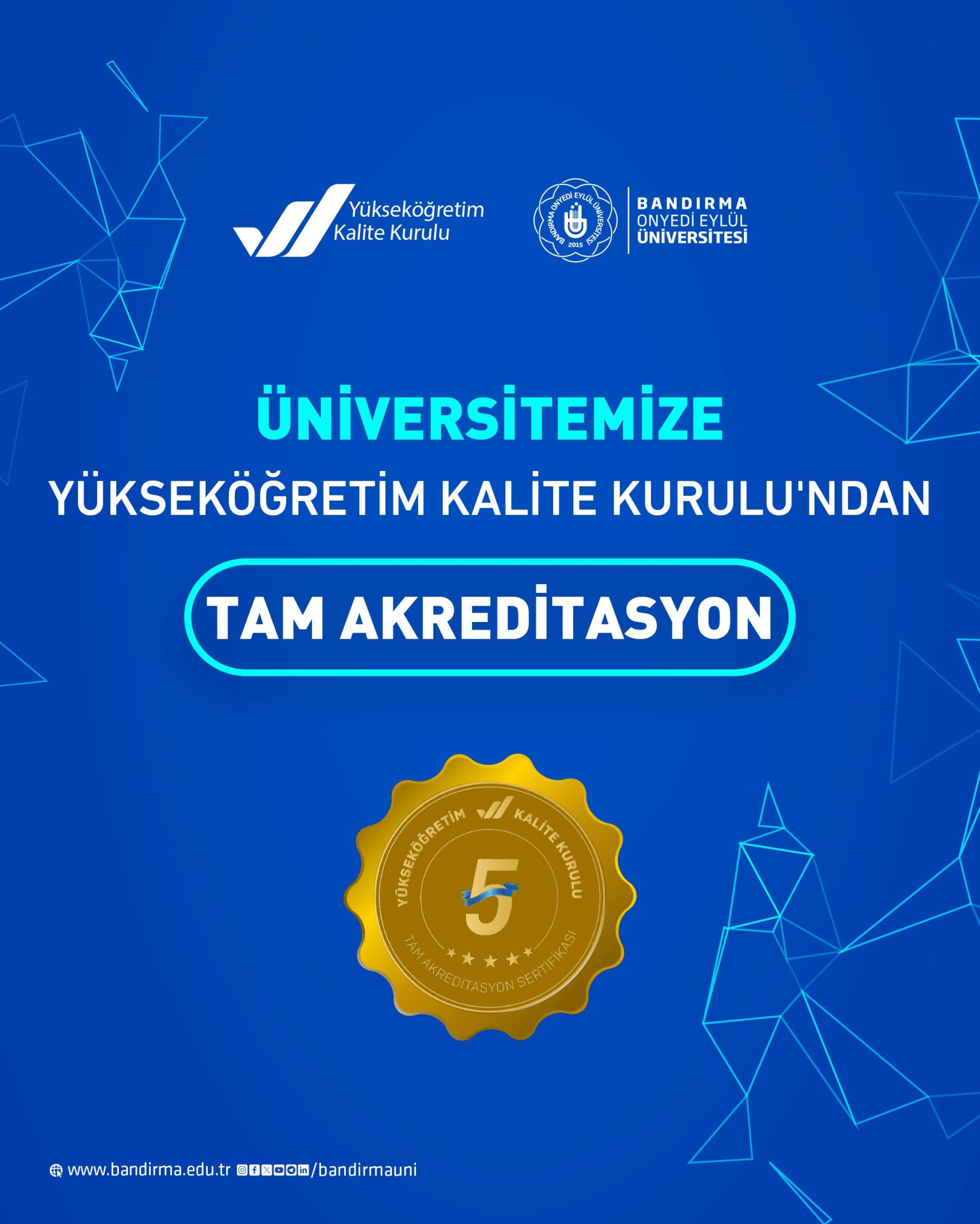 Üniversitemiz, Yükseköğretim Kalite Kurulu (YÖKAK) tarafından yürütülen Kurumsal Akreditasyon Programı (KAP) kapsamında gerçekleştirilen kapsamlı ve çok boyutlu değerlendirmeler sonucunda “5 yıl süreyle Tam Akreditasyon” almaya hak kazanmıştır.