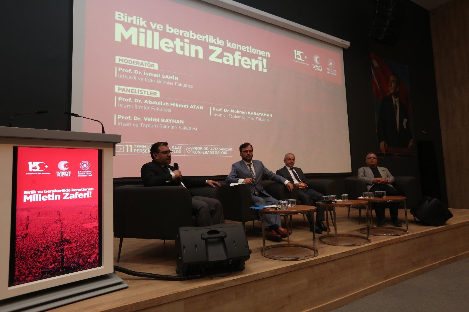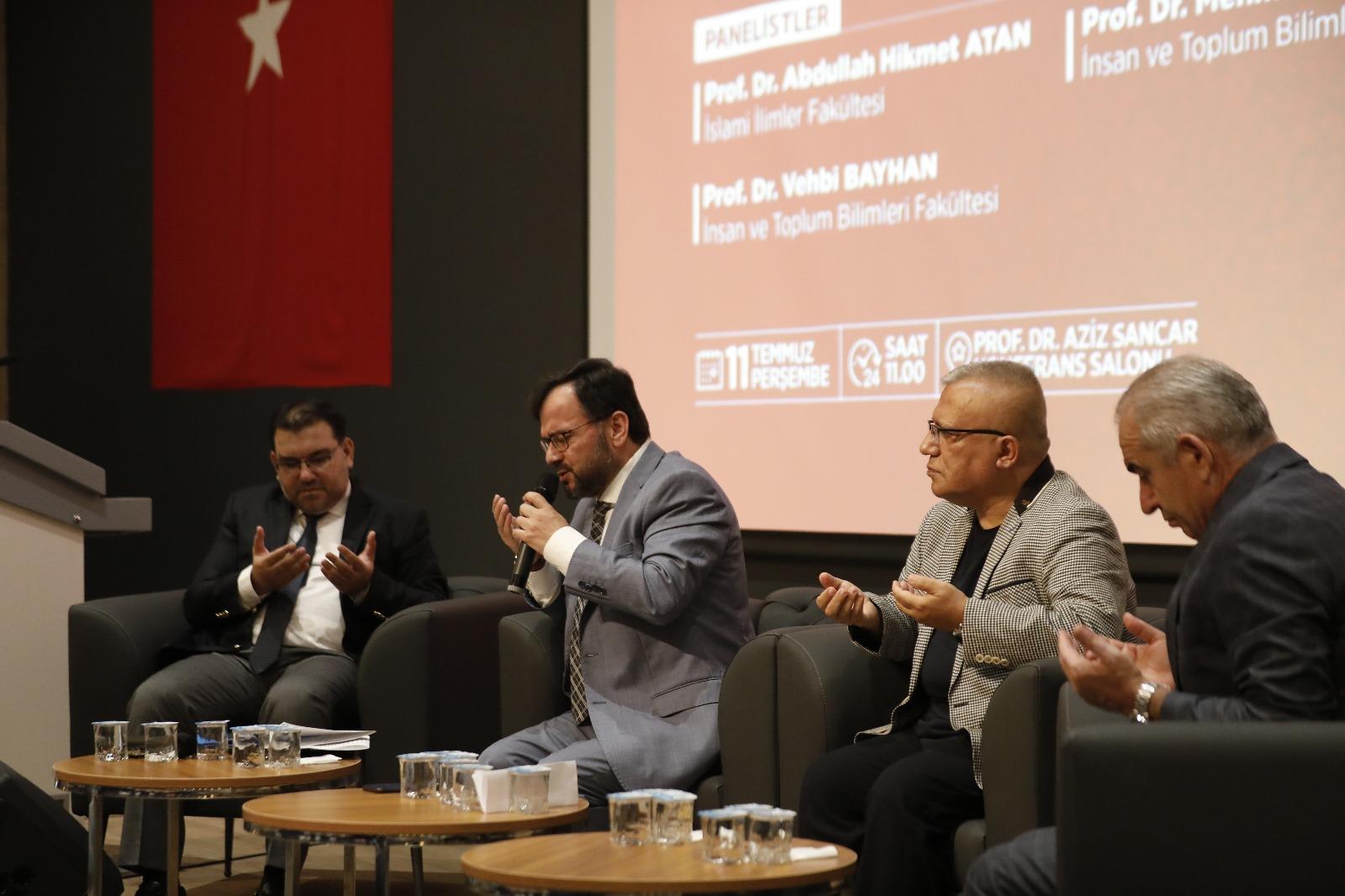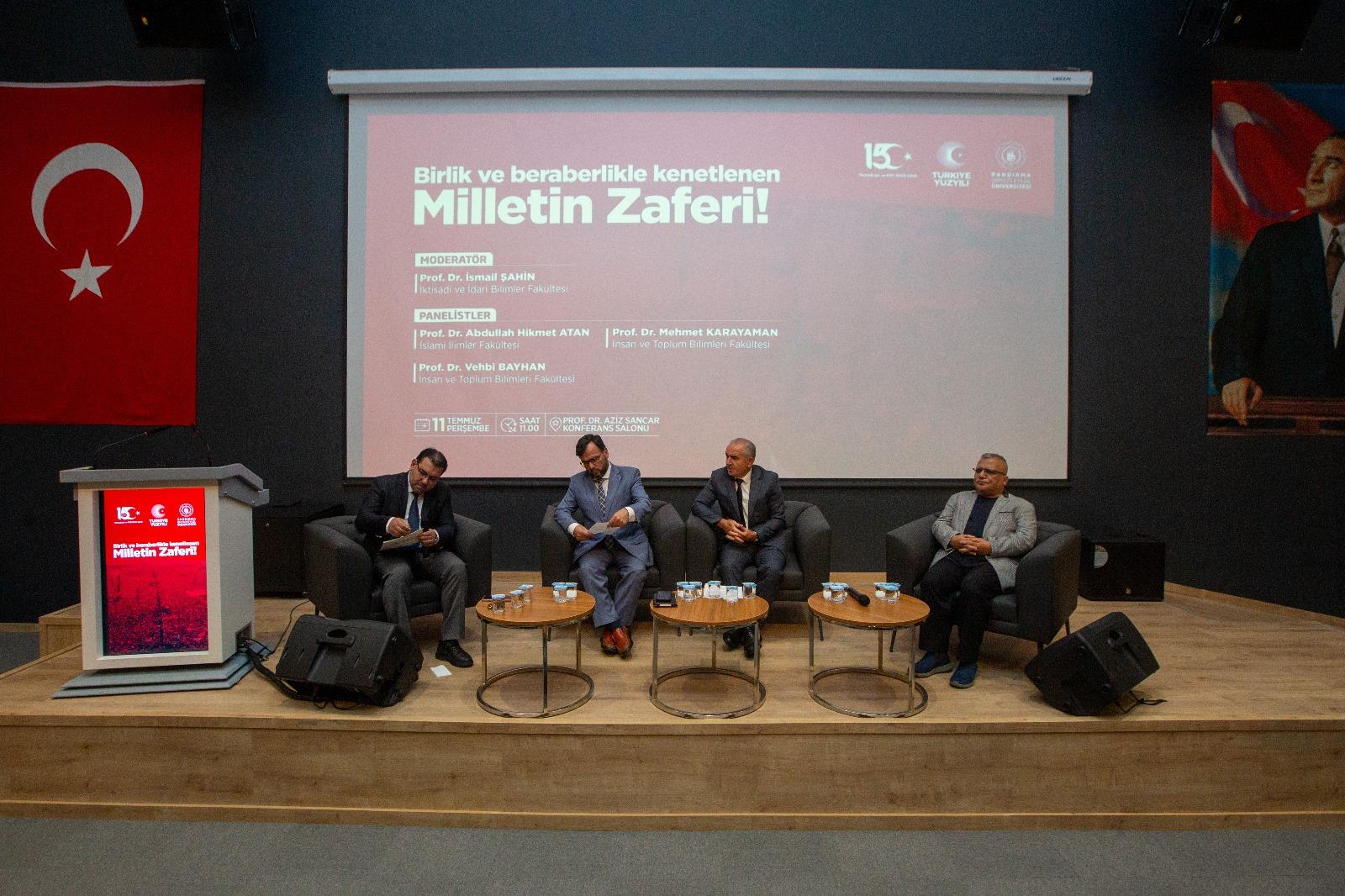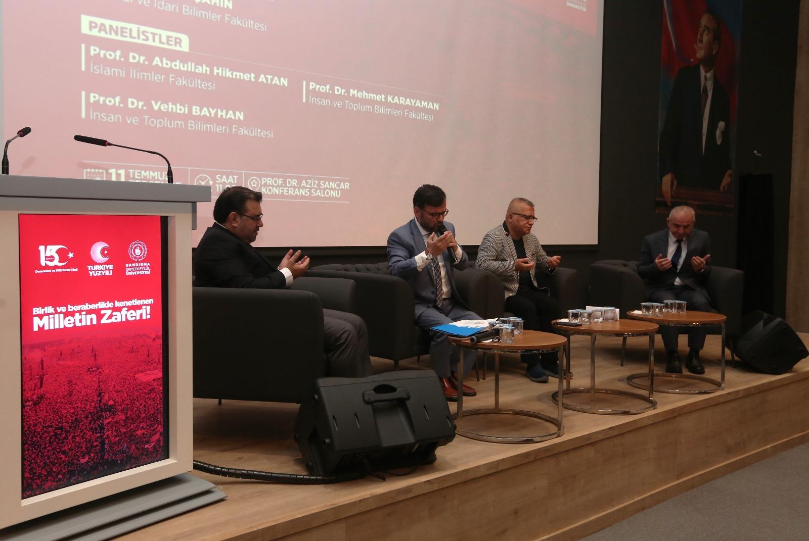 "15 Temmuz Demokrasi ve Milli Birlik Günü" etkinlikleri kapsamında düzenlenen bir diğer program ise Öğrenci Yaşam Merkezi Prof. Dr. Aziz Sancar Konferans Salonu’nda gerçekleştirilen “Birlik ve Beraberlikle Kenetlenen Milletin Zaferi“ konulu panel oldu. Panele ilçe ve üniversite protokolü, akademik ve idari personelimiz ve vatandaşlar katılım gösterdi. Panelin moderatörlüğünü Üniversitemiz İktisadi ve İdari Bilimler Fakültesi Uluslararası İlişkiler Bölüm Başkanı Prof. Dr. İsmail Şahin üstlenirken, İslami İlimler Fakültesi Dekan Vekilimiz Prof. Dr. Abdullah Hikmet Atan, İnsan ve Toplum Bilimleri Fakültesi Türkiye Cumhuriyeti Tarihi Anabilim Dalı Başkanı Prof. Dr. Mehmet Karayaman ve Sosyoloji Bölüm Başkanı Prof. Dr. Vehbi Bayhan panele konuşmacı olarak katılım sağladı.