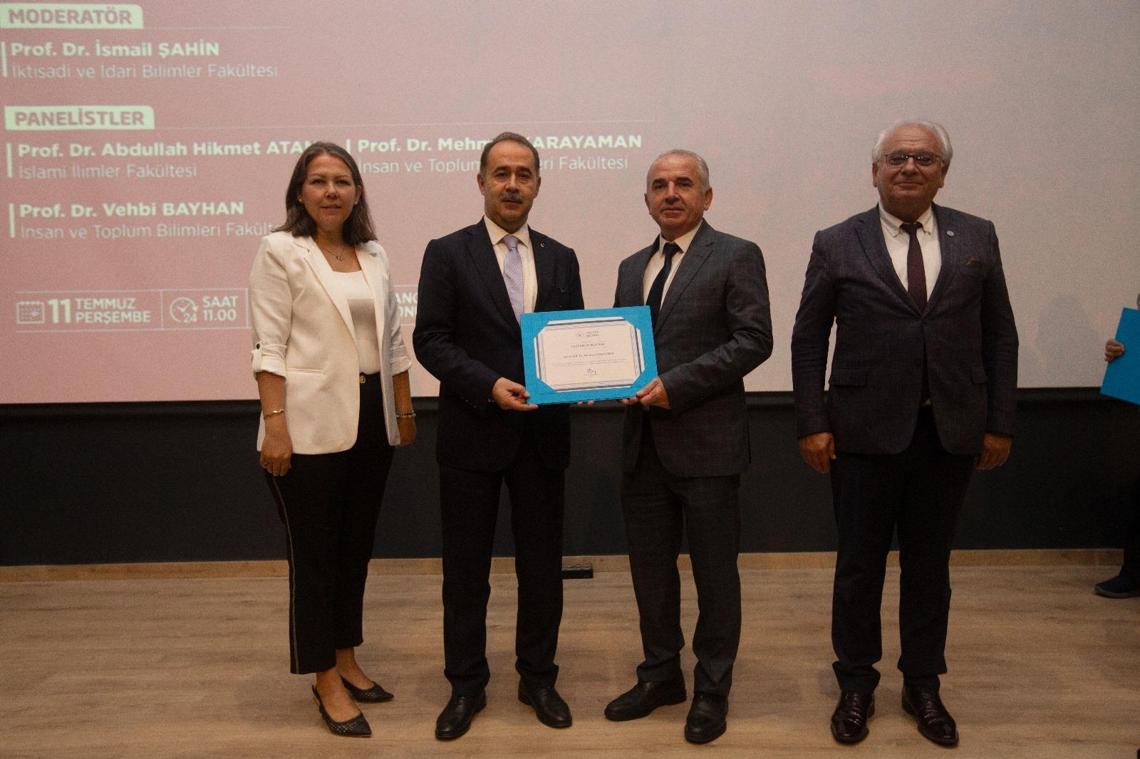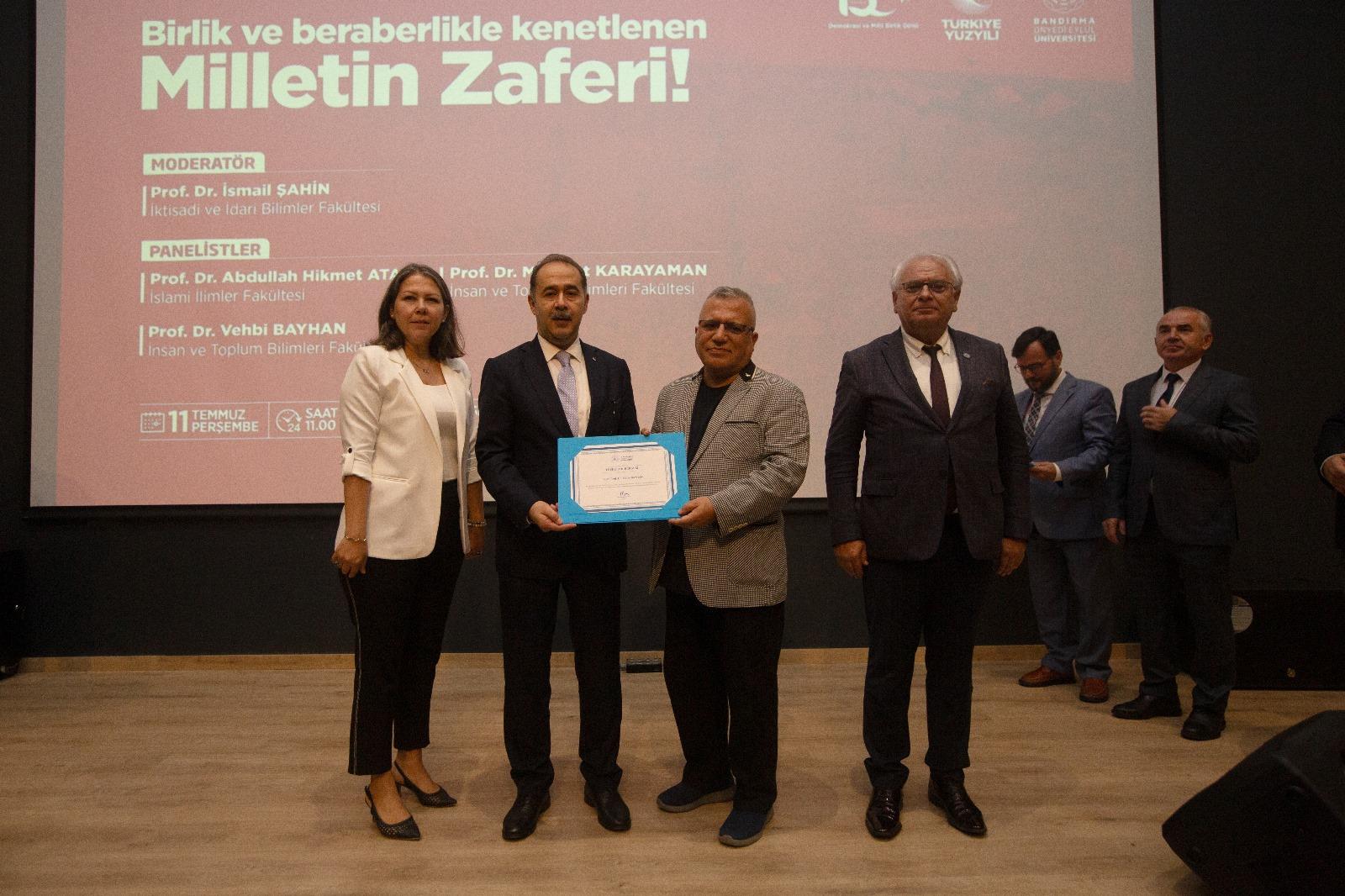 15 Temmuz hain darbe girişiminin Türk dış politikasına somut etkileri, ülkemizde gerçekleşen darbelerin tarihi ile sosyolojik ve dini boyutlarının ele alındığı panel, Bandırma Kaymakamı Engin Aksakal tarafından konuşmacı hocalarımıza teşekkür belgelerinin takdim edilmesi ve toplu fotoğraf çekiminin ardından sona erdi.