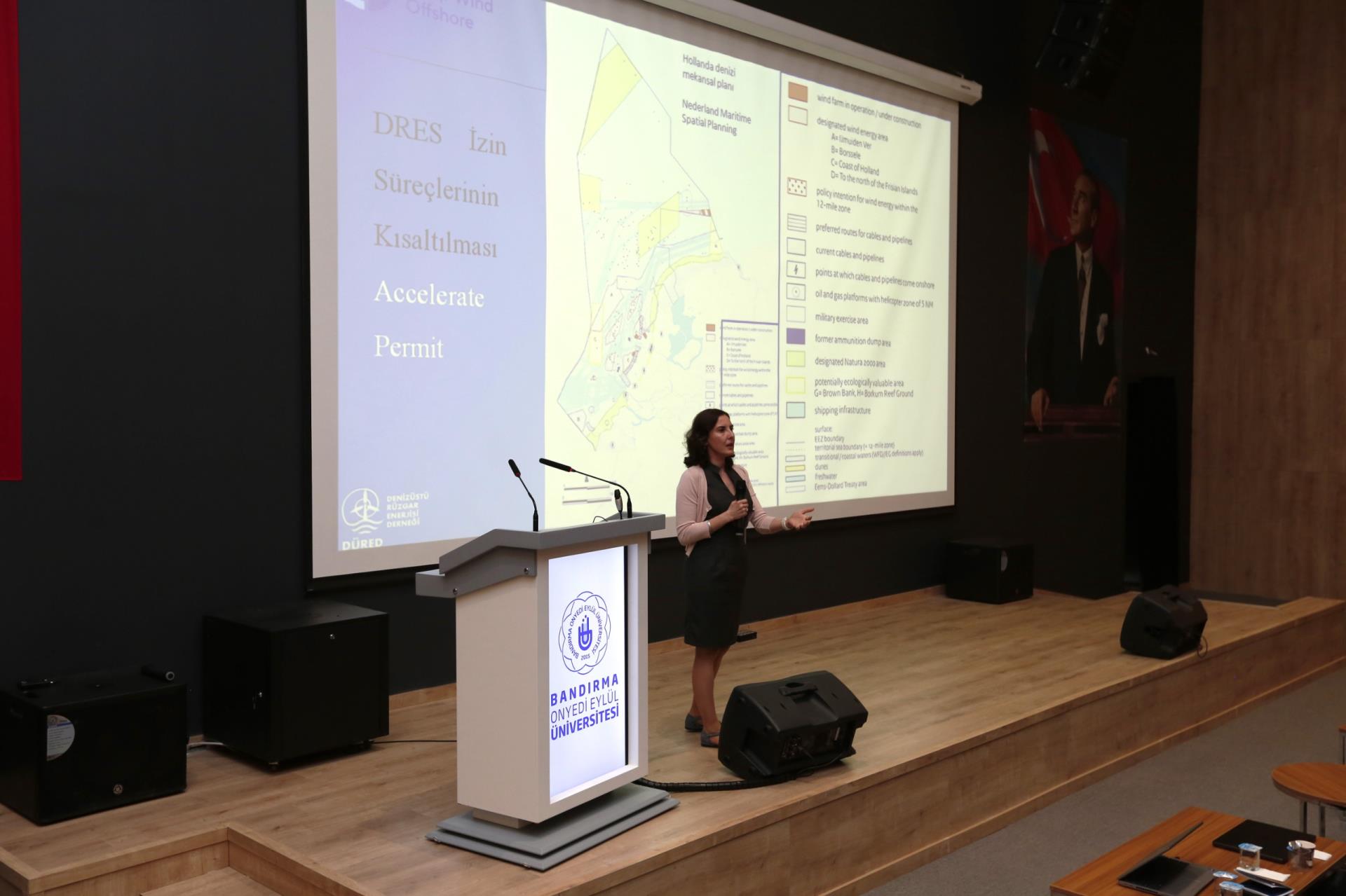 İkinci oturuma denizüstü rüzgar teknisyenleri yetiştirilmesine yönelik eğitim veren Energy Innovation firmasından Frank Emil Moen mesleki eğitim alanındaki altyapılarını ve Üniversitemizle olası mesleki eğitim işbirliği fırsatlarını değerlendirdi. Oturumun devamında ETİ MADEN İşletmeleri Genel Müdürlüğü adına Dr. Ebru Karaçay tarafından ETİ MADEN’in yeşil dönüşüm vizyonu ortaya kondu. TÜBİTAK MAM adına etkinliğe katılım sağlayan Doç. Dr. Fehmi Akgün'ün Türkiye’deki hidrojen araştırmalarını anlattığı oturum, Denizcilik Meslek Yüksekokulu akademisyenlerimizden Dr. Öğr. Üyesi Sabri Alkan’nın “Bandırma Onyedi Eylül Üniversitesi Yeşil Deniz Endüstrisi Ar-Ge, Test ve Eğitim Merkezi” sunumuyla sona erdi.