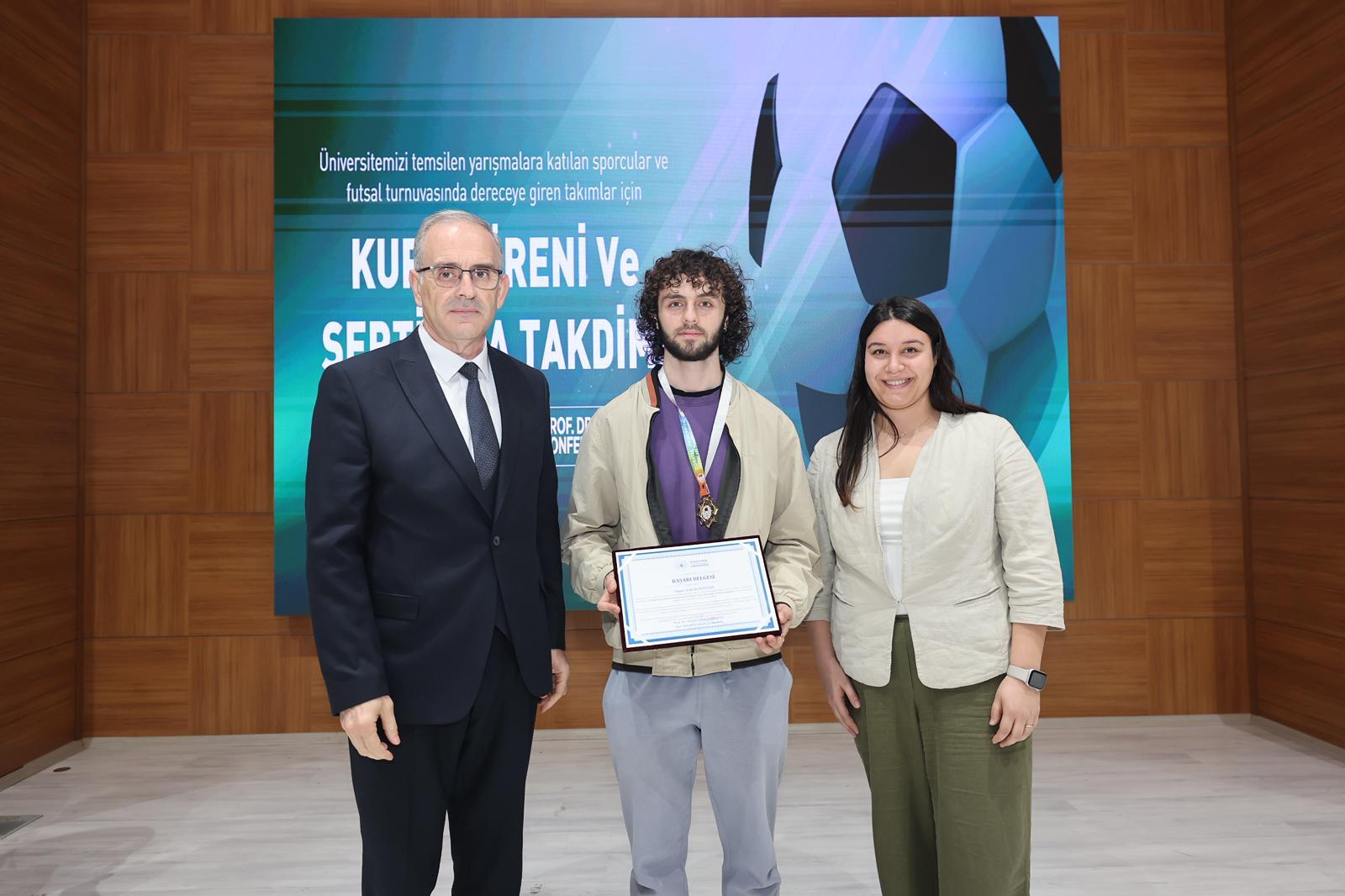 Programda, üniversitemizi başarıyla temsil eden sporcularımız ile futsal turnuvasında derece elde eden takımlarımız sahneye davet edilerek tebrik edildi. Sporcularımız ve takımlarımız, alkışlar eşliğinde ödüllerini alırken, program coşkulu anlara sahne oldu.