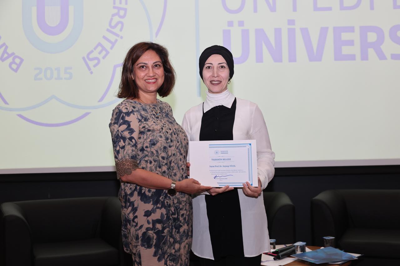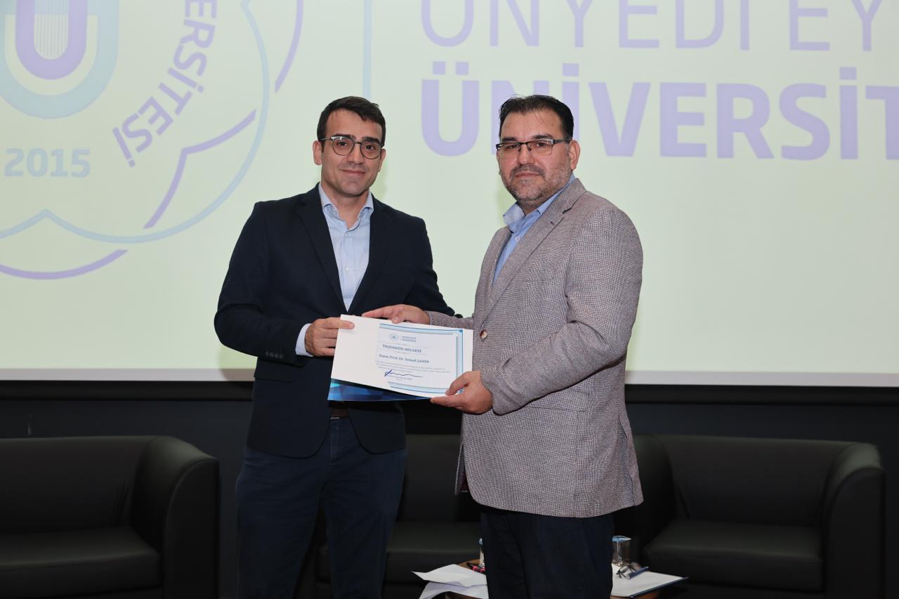 Programın sonunda, İktisadi ve İdari Bilimler Fakültesi Dekanımız Prof. Dr. Serap Palaz ve Dekan Yardımcısı Prof. Dr. Fatih Ayhan tarafından panelin moderatörlüğünü üstlenen Prof. Dr. İsmail Şahin'e, panele konuşmacı olarak katkı sağlayan Prof. Dr. Zeynep Yücel ve Dr. Öğr. Üyesi Alptekin Molla'ya teşekkür belgeleri takdim edildi.