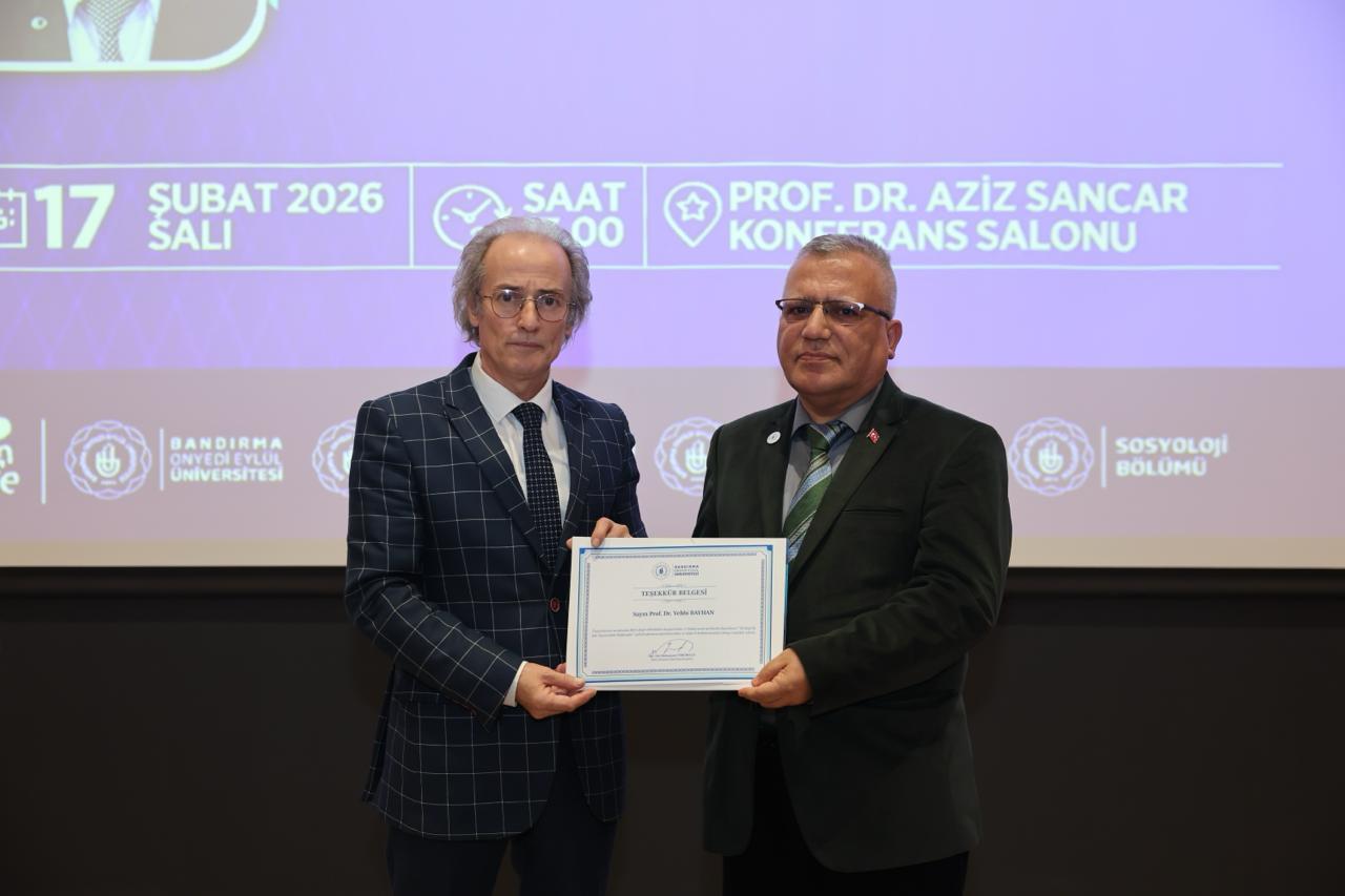 Üniversitemiz Bilim İletişimi Ofisi ile İnsan ve Toplum Bilimleri Fakültesi Sosyoloji Bölümü iş birliğinde “Türkiye’de Aile Yapısındaki Değişmeler” konulu konferans düzenlendi. Prof. Dr. Aziz Sancar Konferans Salonu’nda gerçekleştirilen konferansa İnsan ve Toplum Bilimleri Fakültesi Dekanımız Prof. Dr. Zekai Mete, Adalet Bakanlığı Bandırma Denetimli Serbestlik Şube Müdürü Özcan Deniz, akademik ve idari personelimiz, öğrencilerimiz ile vatandaşlarımız katılım sağladı.